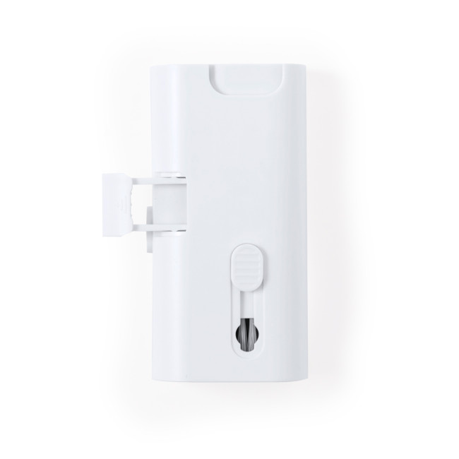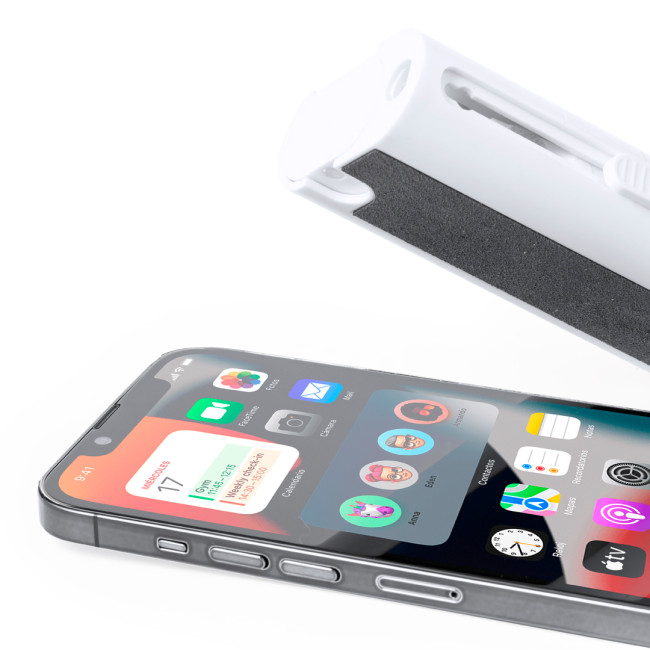 Set completo di pulizia a 6 funzioni, appositamente studiato per la cura e la manutenzione dei gadget tecnologici. Tutti gli accessori sono alloggiati all'interno della custodia e sono pronti all'uso facendo scorrere il pulsante corrispondente a ciascuno di essi. Include serbatoio interno ricaricabile con spruzzatore, area di pulizia dello schermo, punta in metallo, bastoncino di pulizia, spazzole di diverse forme e accessorio per la rimozione dei tasti. Realizzato in resistente ABS, con elegante design bianco e presentato singolarmente in una scatola kraft di design.