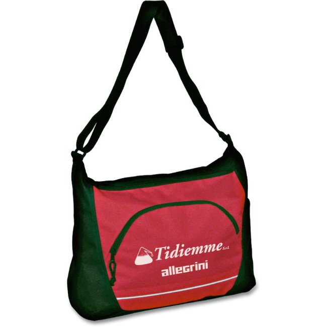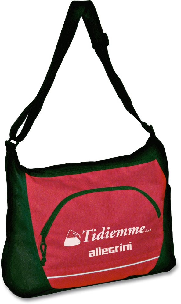 Borsa a tracolla bicolore rosso e nero, interno in pvc, ampia tasca interna unica, tasca frontale a mezza luna porta oggetti laterale, tracolla regolabile. Confezione in polybag.