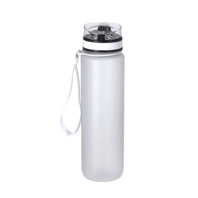 Borraccia da 1L in RPET resistente con finitura opaca traslucida. Con indicatori di capacità in litri e once, insieme a frasi motivazionali per favorire una corretta idratazione. Tappo a vite nero e coperchio in plastica trasparente con chiusura push. Dotata di beccuccio, chiusura di sicurezza e comoda tracolla. BPA-free.