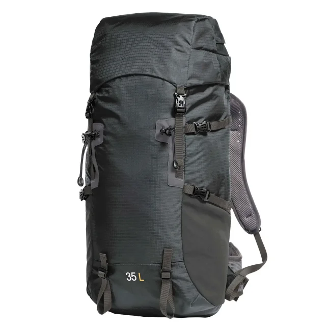100% Nylon 210d. Zaino con sistema di bretelle regolabili, cinghia al petto regolabile in altezza, cinturino imbottito in vita. Dimensioni: 29 x 66 x 21 cm, capacita': 35 litri, area di stampa: 6.5 x 30 cm.