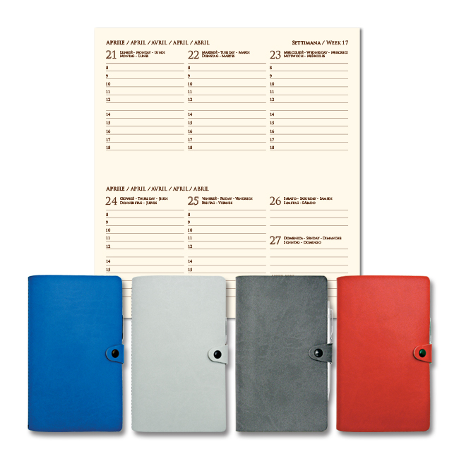 Grafica interna settimanale 8,7x15,9 in carta avorio certificata Fsc da 60 grammi,144 pagine con rubrica tlefonica inclusa.