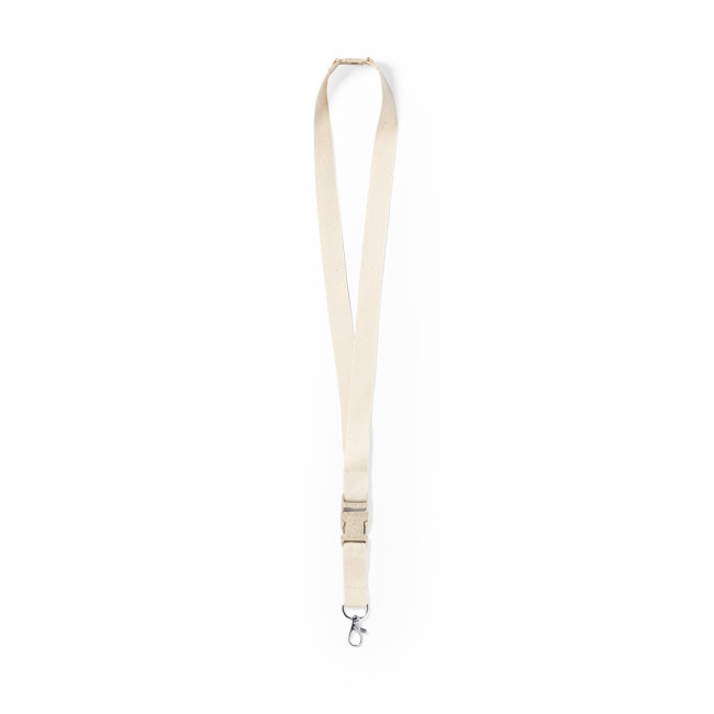 Lanyard della linea natura in materiale cotone. Fibbia e chiusura di sicurezza sul collo in fibra di grano/PP, per favorire l'utilizzo di materie prime naturali e ridurre le emissioni inquinanti.Con moschettone rotante in metallo, disponibile in colore naturale.