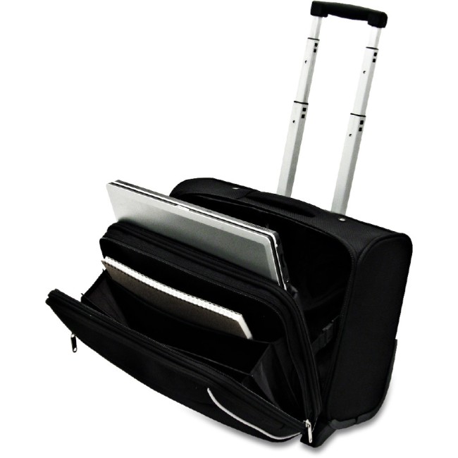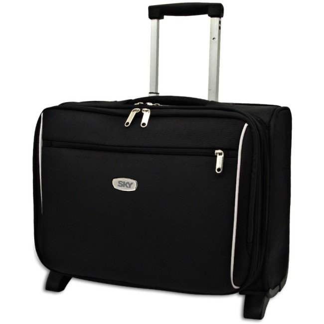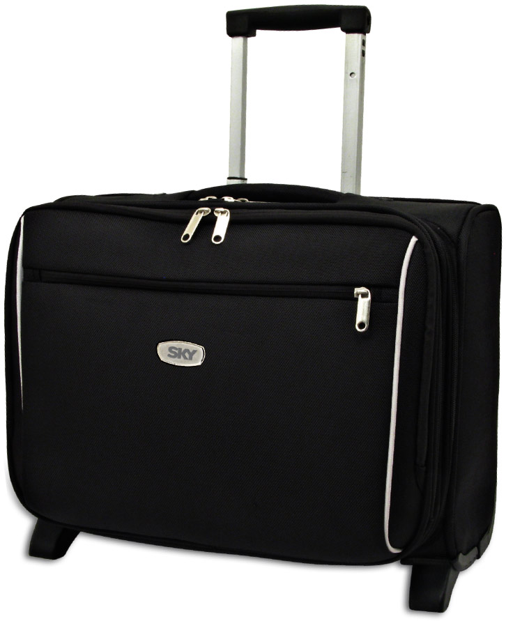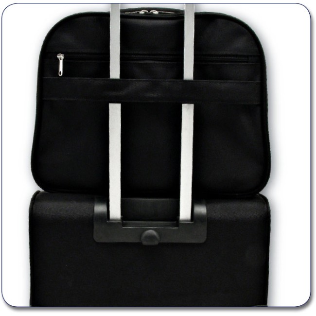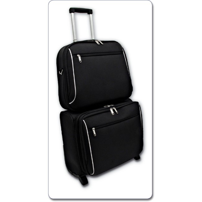 Trolley case "WRC" in 1680D poliestere nero, fodera interna in 210T in poliestere nero. 3 ampi scomparti con cerniera e cursori in metallo grigio, di cui uno ? un vano portacomputer imbottito, ampia stampa frontale con cerniera. Confezione in polybag.
