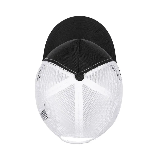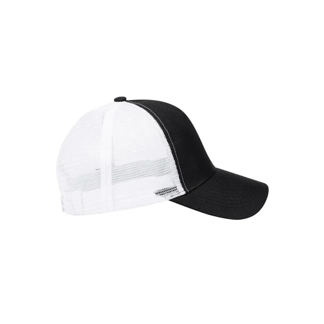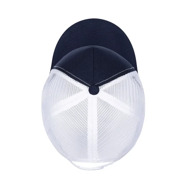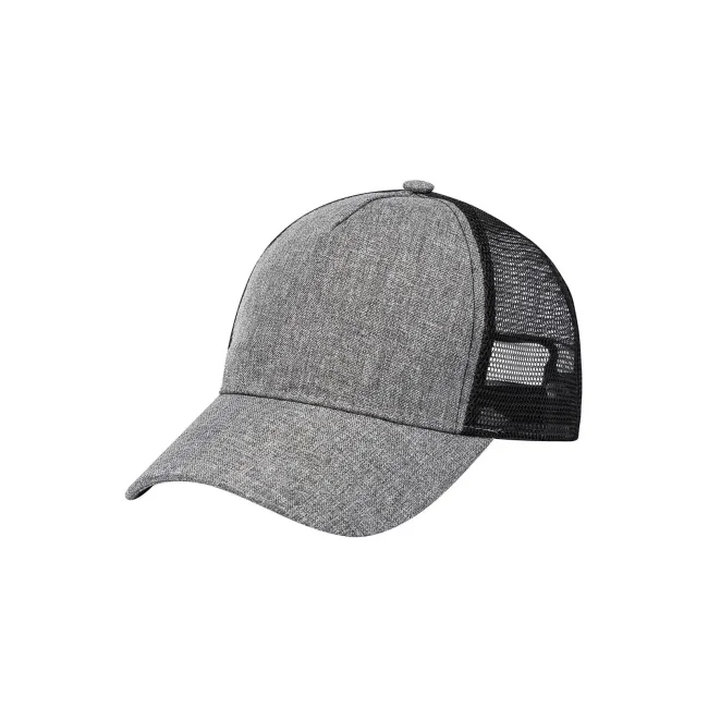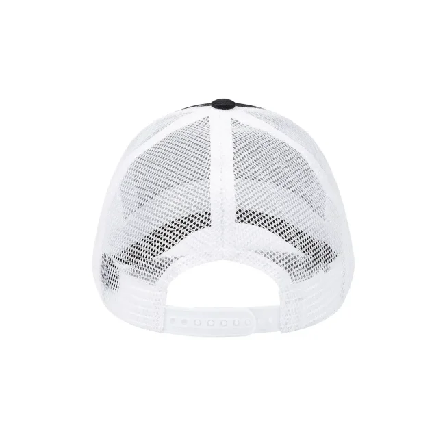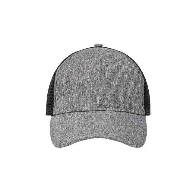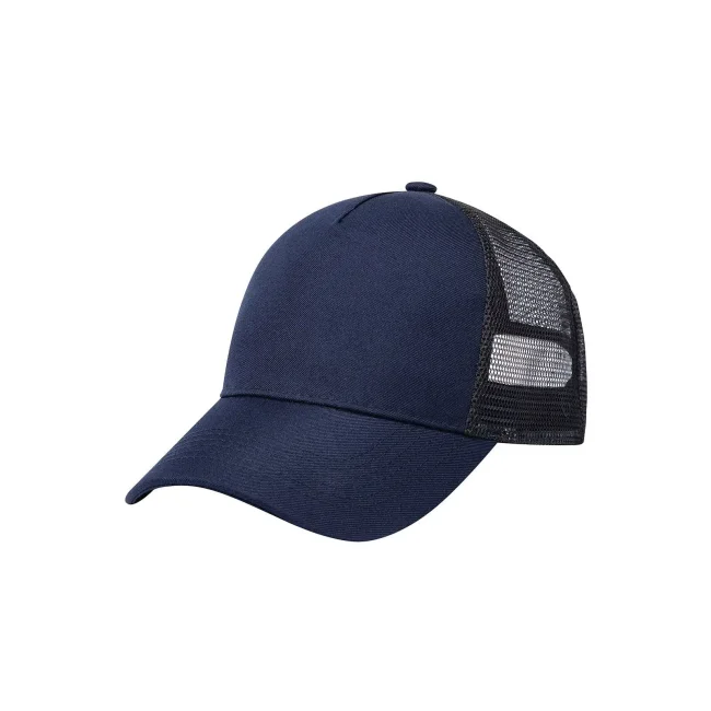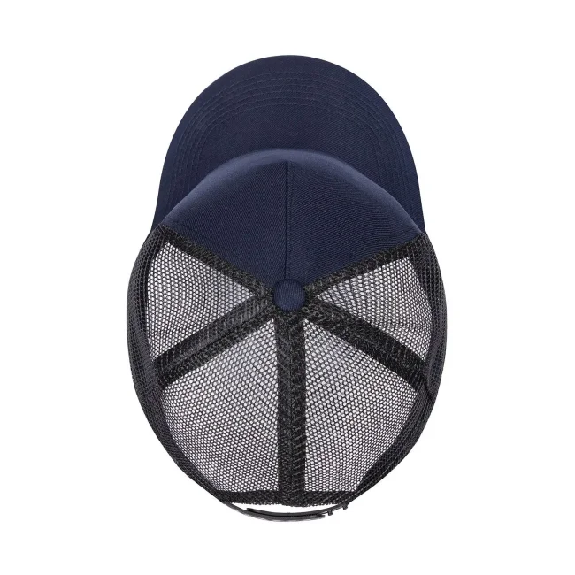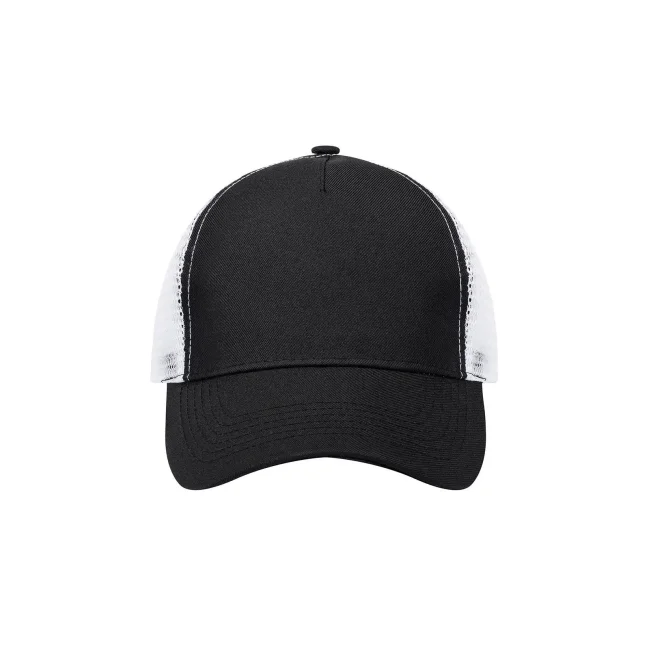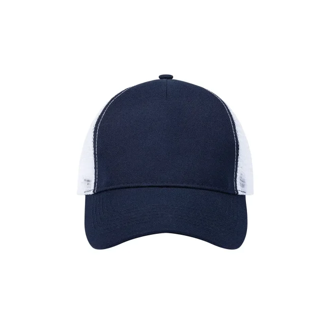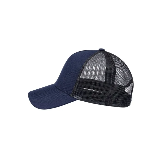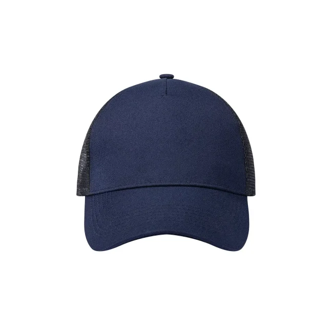 Tessuto esterno: 100% poliestere riciclato, 210 g/m². Lato inferiore visiera: 100% poliestere riciclato, 210 g/m². Mesh: 100% poliestere riciclato, 110 g/m². Cappellino trucker sostenibile con mesh, 5 pannelli, visiera curva, regolabile chiusura Click & Snap, fascia antisudore integrata, pannelli in rete sulla parte posteriore, 6 cuciture ornamentali sulla visiera. STANDARD 100 by Oeko-Tex®.
