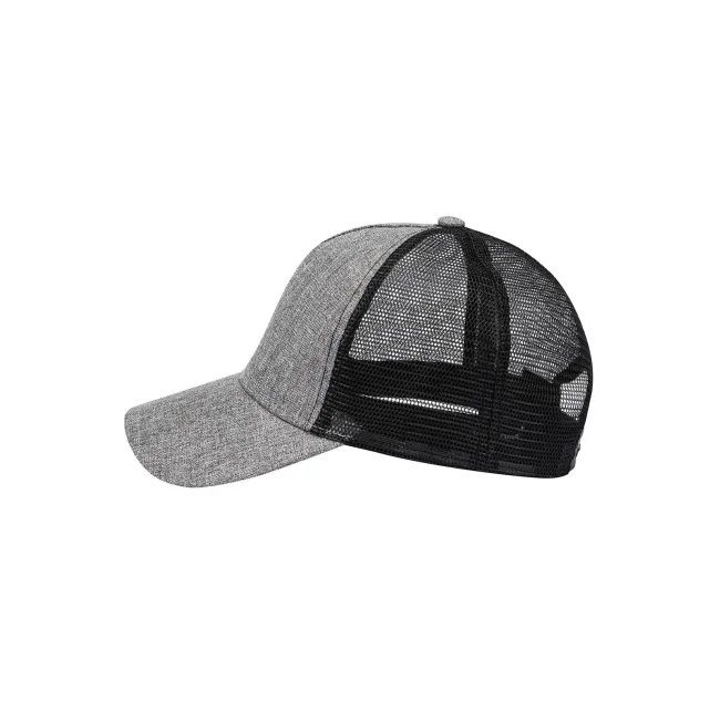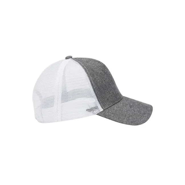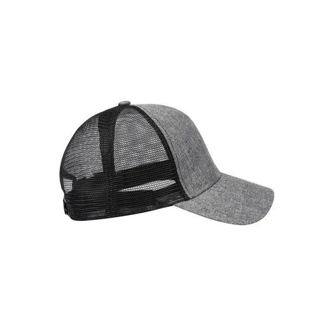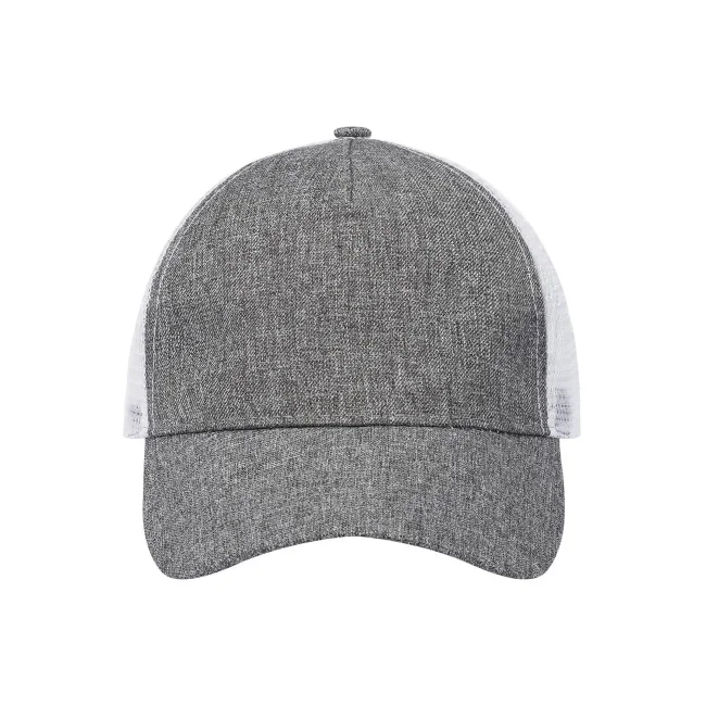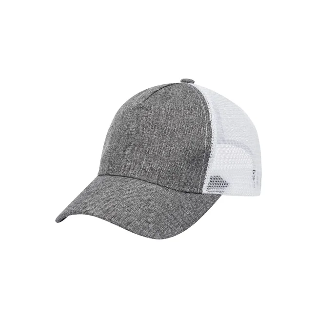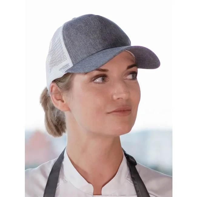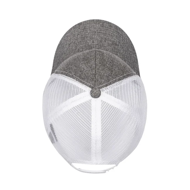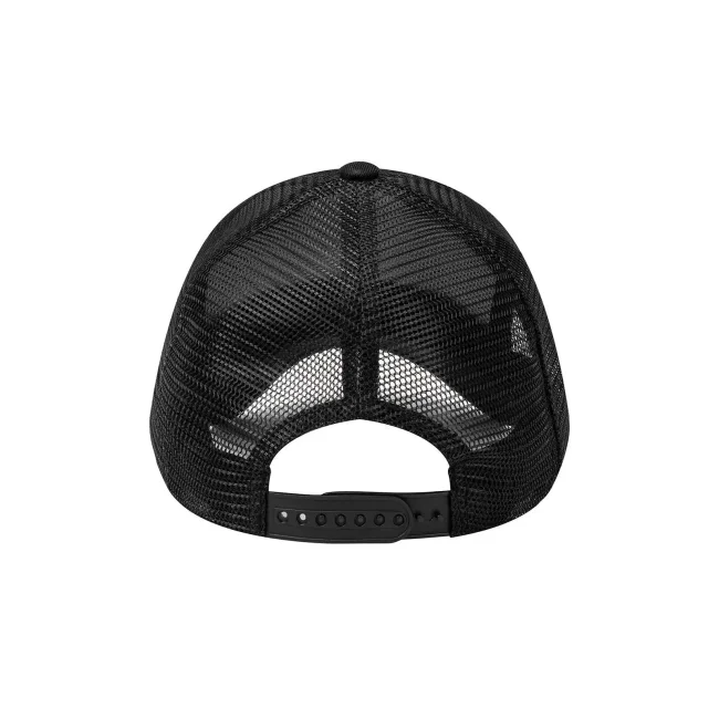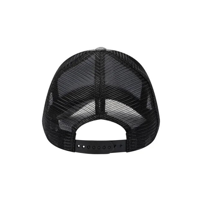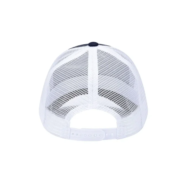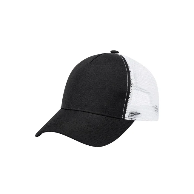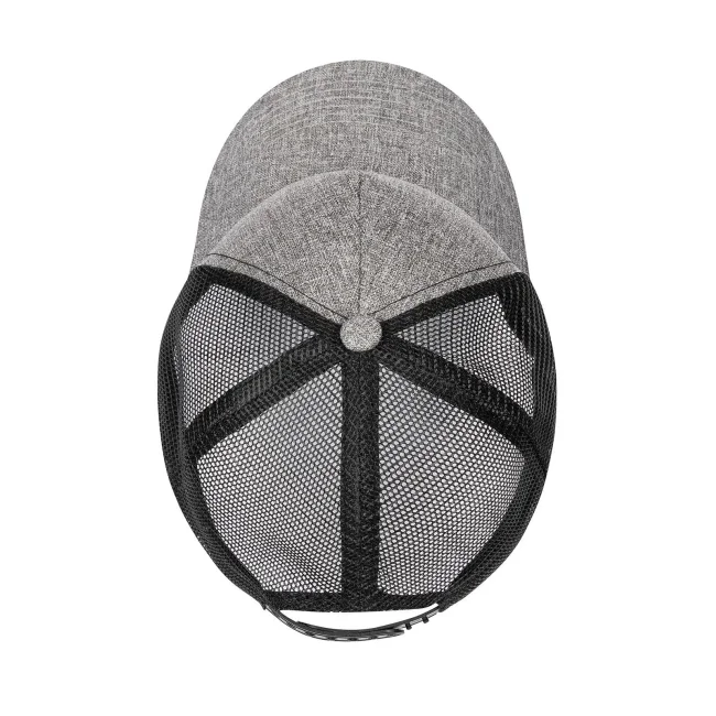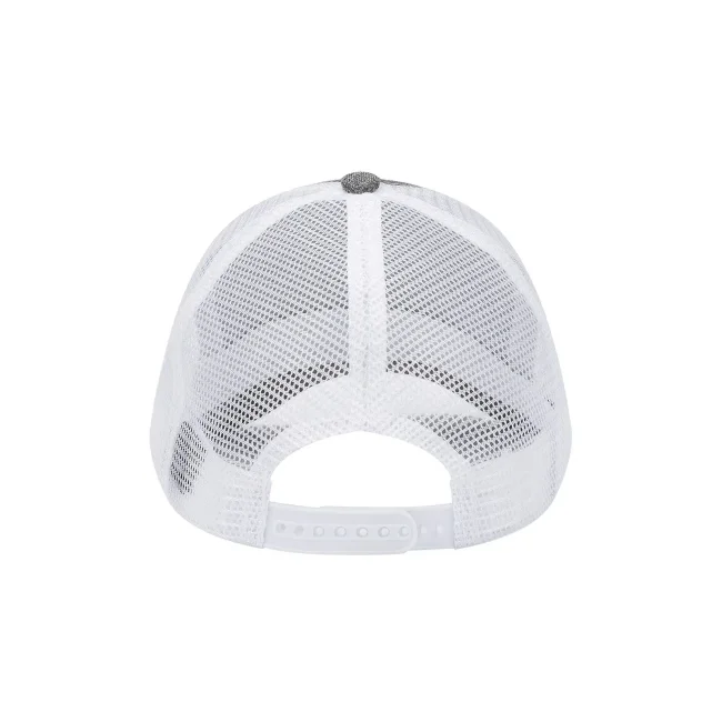 Tessuto esterno: 100% poliestere riciclato, 210 g/m². Lato inferiore visiera: 100% poliestere riciclato, 210 g/m². Mesh: 100% poliestere riciclato, 110 g/m². Cappellino trucker sostenibile con mesh, 5 pannelli, visiera curva, regolabile chiusura Click & Snap, fascia antisudore integrata, pannelli in rete sulla parte posteriore, 6 cuciture ornamentali sulla visiera. STANDARD 100 by Oeko-Tex®.