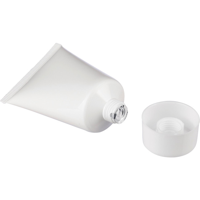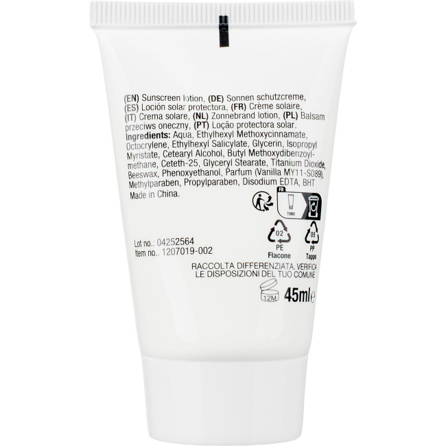 Tubo di protezione solare in PE riempito con 45 ml di protezione solare SPF30 profumata alla vaniglia. Dermatologicamente testato e con una durata di conservazione fino a 3 anni dalla data di produzione.