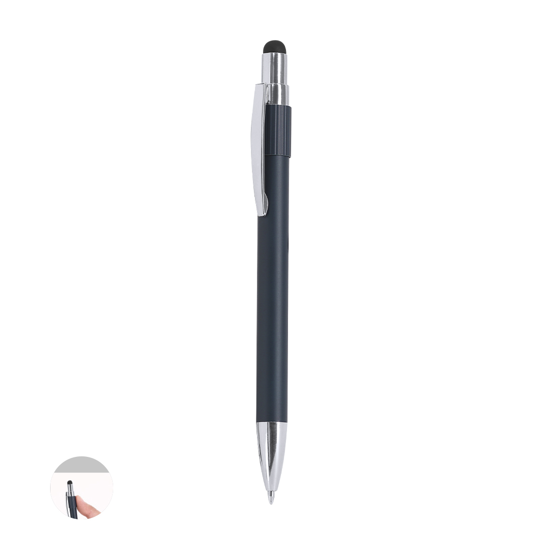 Elegante penna puntatore in Alluminio Riciclato. Meccanismo a pulsante con finitura opaca e punta nera sulla parte superiore, inchiostro blu. Clip e accessori con finitura cromata. Include sistema spinner anti-stress. Logo Alluminio Riciclato inciso.