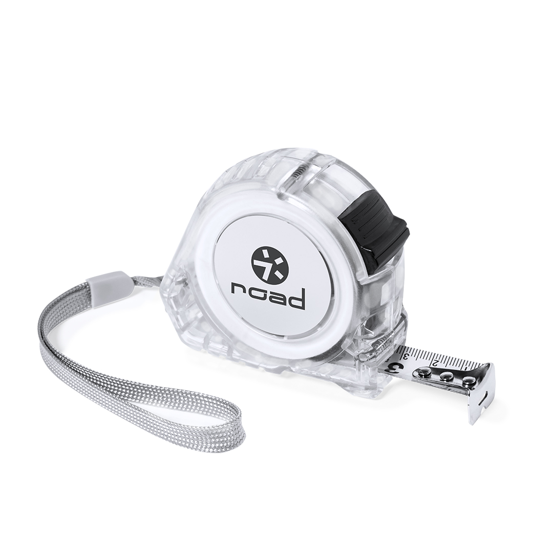Flessometro da 5 metri con lama in metallo e meccanismo di bloccaggio. Con corpo in originale finitura trasparente, clip da cintura in metallo e cinghia di trasporto, con una zona speciale di stampa. Confezionato singolarmente in una scatola dal design kraft.