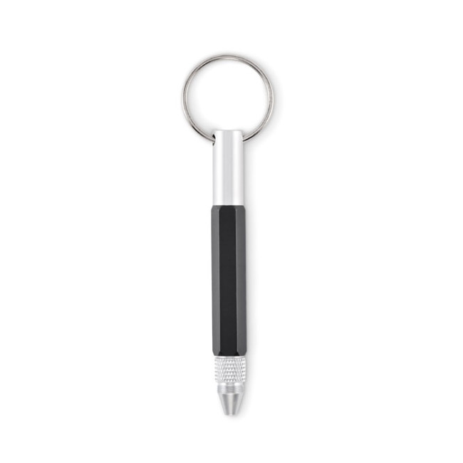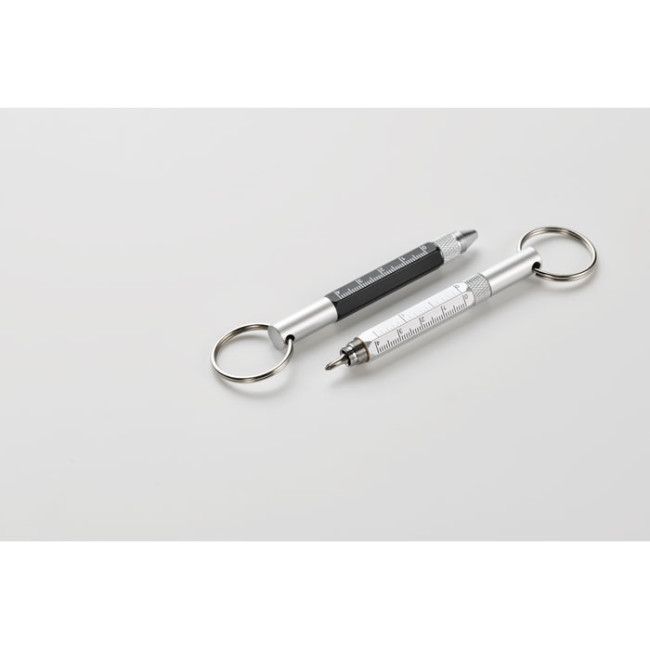 Portachiavi con penna a rotazione in alluminio riciclato con righello da 4 cm e 1,5 pollici, stilo e cacciavite 2 in 1 a testa piatta e a croce. Inchiostro nero.
