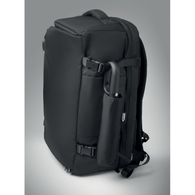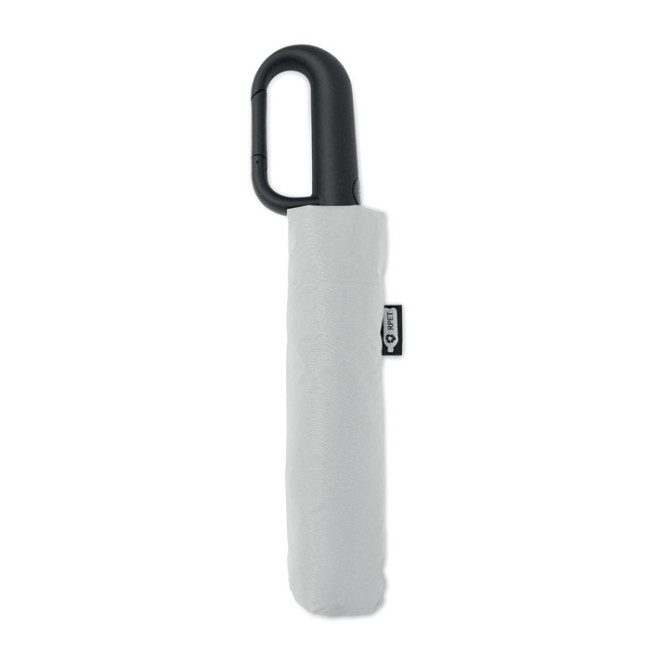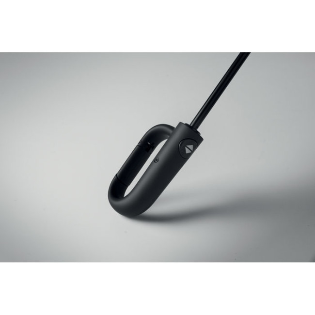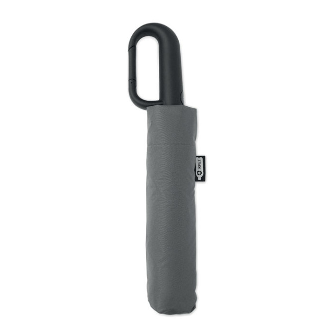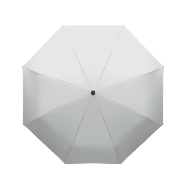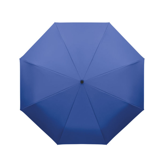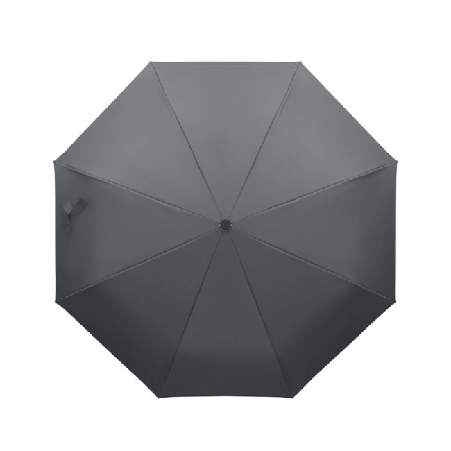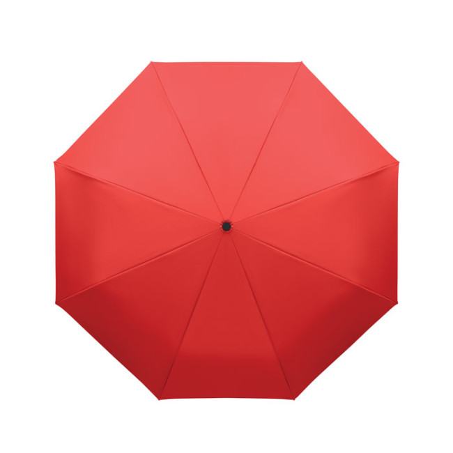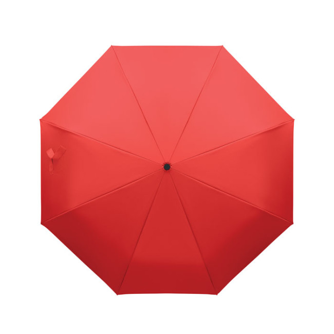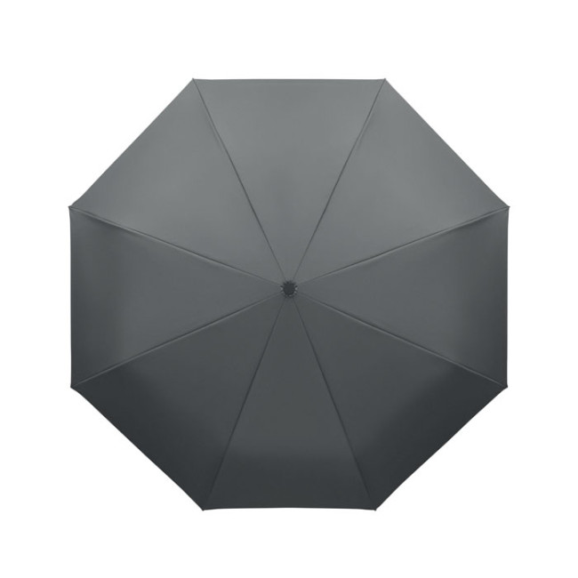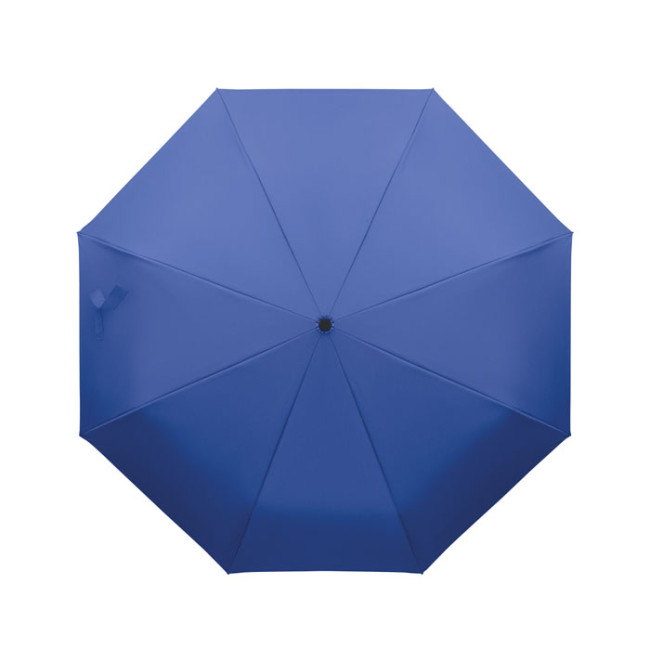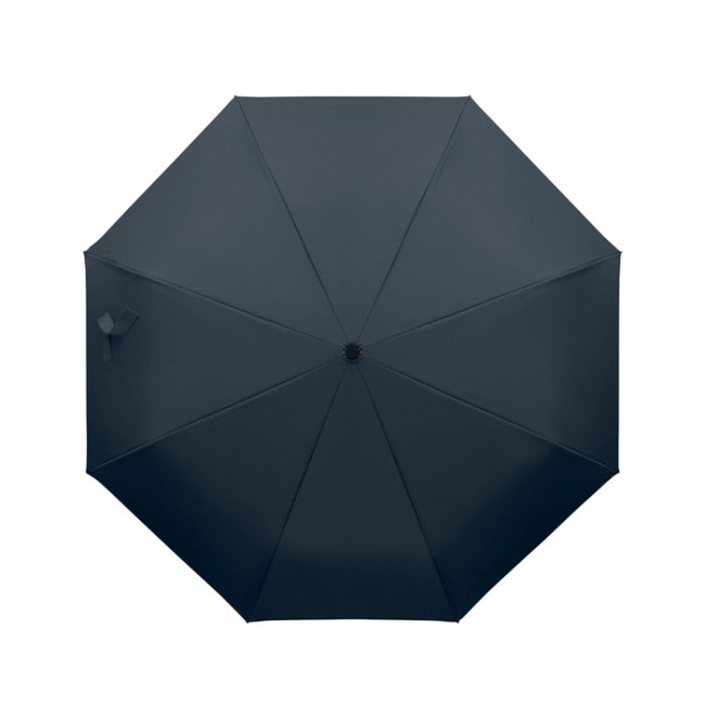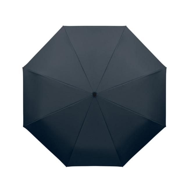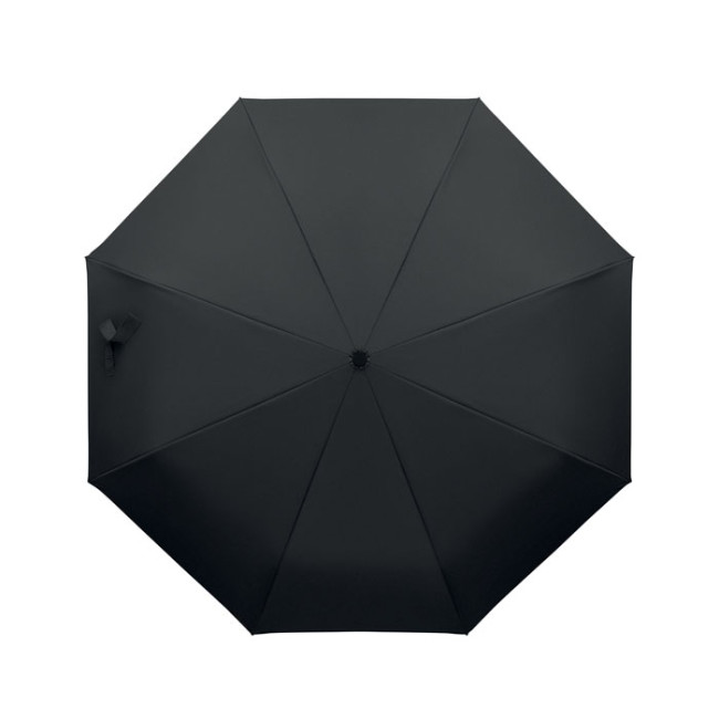 Ombrello pieghevole antivento da 21'' con struttura in fibra di vetro a 2 sezioni con placcatura nera. Costole in fibra di vetro. pannelli in pongee 190T RPET. Manico a D con moschettone e finitura in gomma. Apertura e chiusura automatica. Include custodia