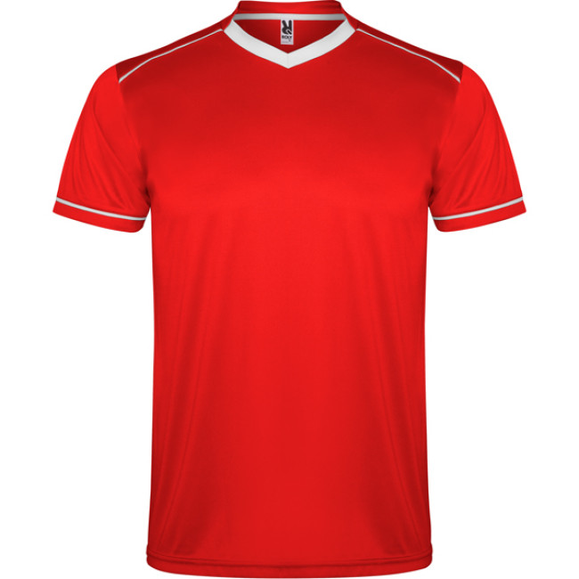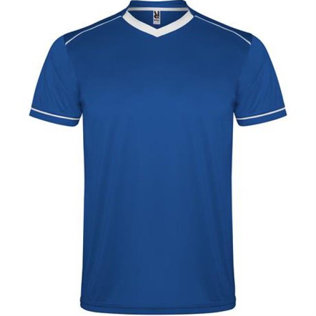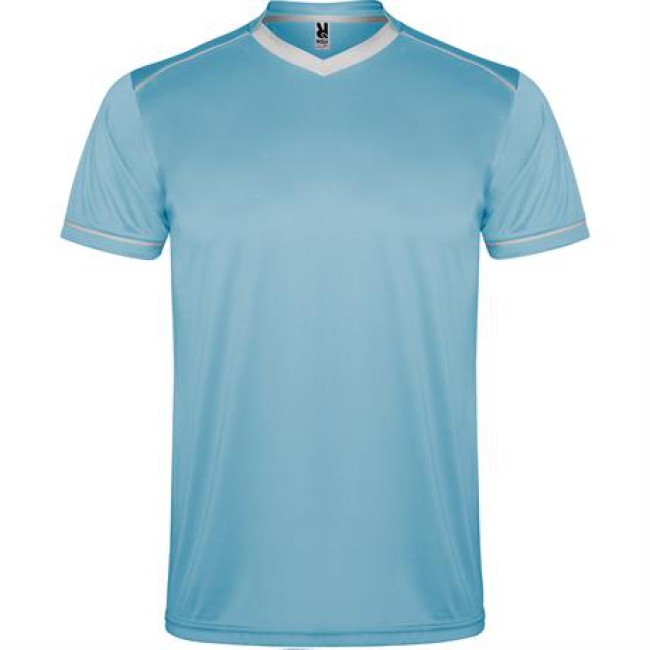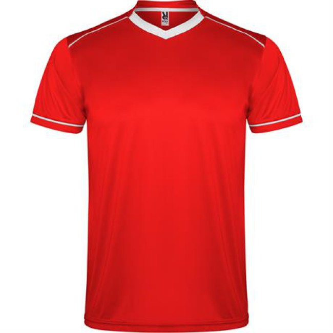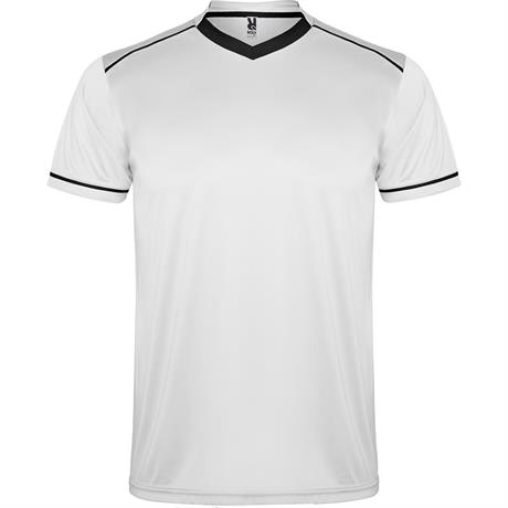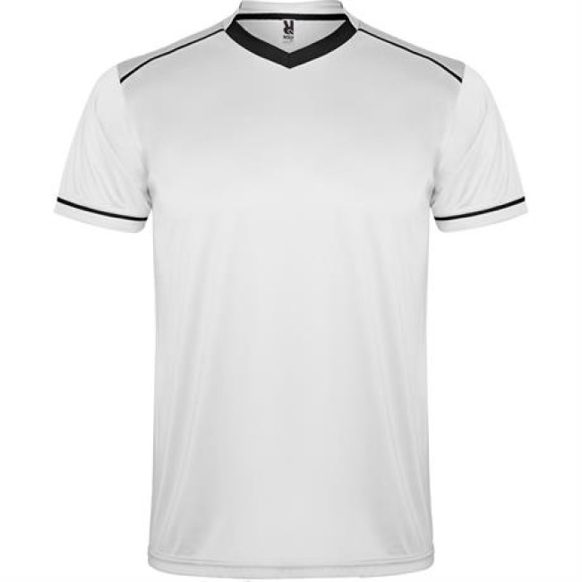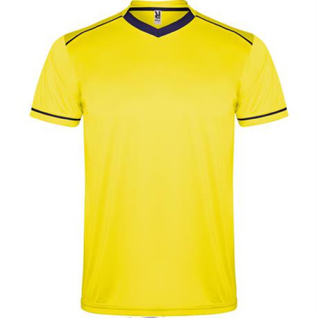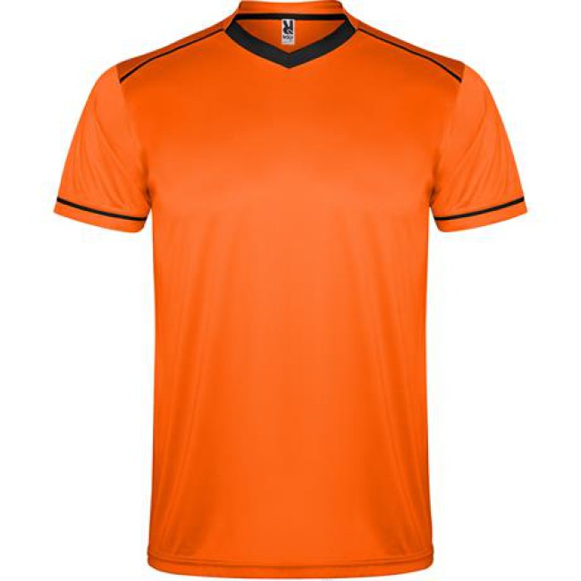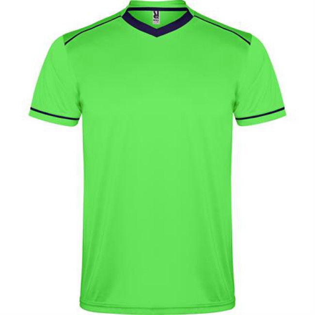 Completo sportivo composto da maglietta e pantaloncino.1.- Maglietta con doppio collo a V bicolore, copri cuciture di rinforzo all'interno.2.- Spalla con inserto in fettuccia e colore a contrasto.3.- Manica corta con apertura a vivo e orlo in colore a contrasto.4.- Pantalone corto con girovita elastica, cordoncino regolabile all'interno e impuntura di sicurezza.