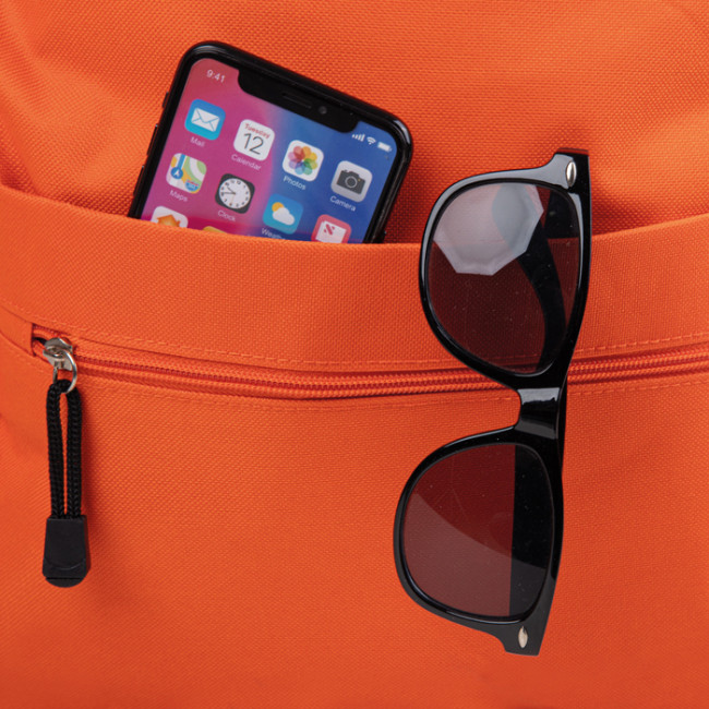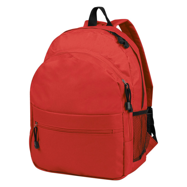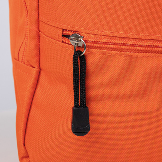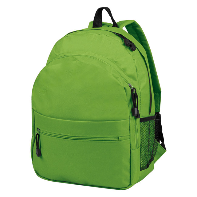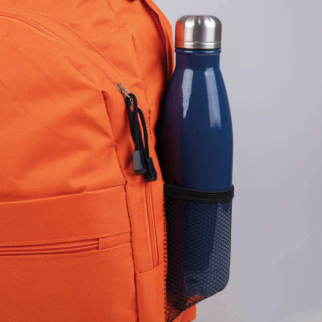 zaino in poliestere 600D doppio compartimento con cerniera due tasche frontali schienale e spallacci imbottiti e regolabili tasca laterale in materiale traforato