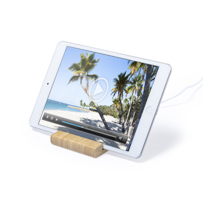 Caricabatterie wireless 15W Linea Nature line, supporto per smartphone e tablet integrato. Corpo in legno di bambù naturale. Include un cavo micro USB da 1m ed è compatibile con i dispositivi dotati di tecnologia di ricarica senza fili. Provvisto di un'ampia superficie di stampa e confezionato singolarmente in scatola di design ecologico.