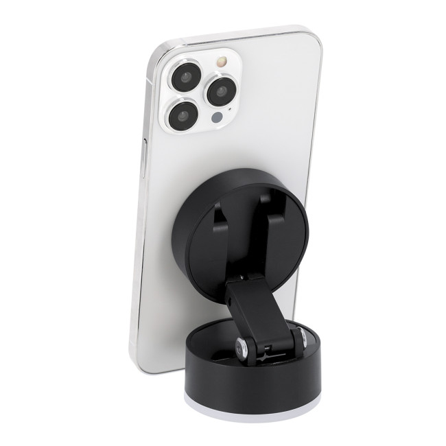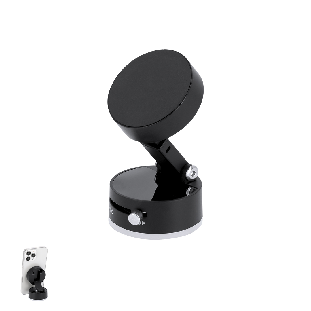 Portatelefono magnetico in ABS. Chiusura a ventose con il pulsante ON/OFF on/off. Include un anello metallico magnetico. Dispone di un supporto retrattile regolabile, ideale come soluzione per fissare il dispositivo in modo stabile e versatile su qualsiasi superficie.