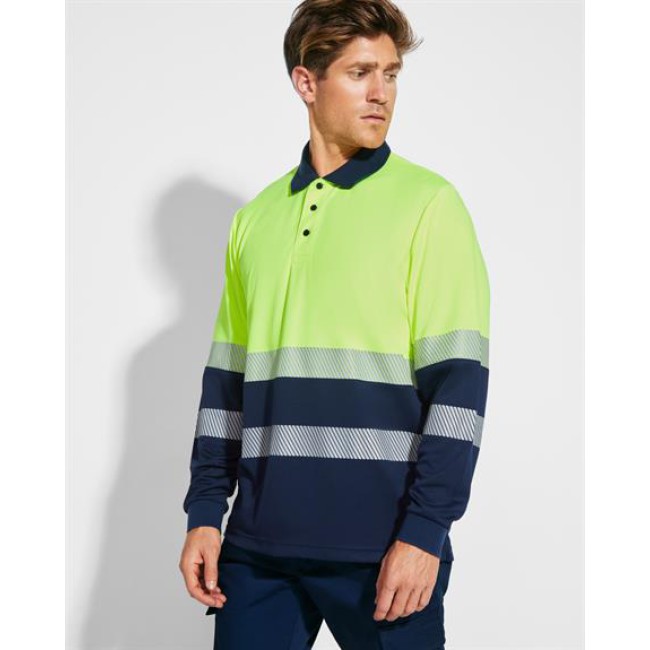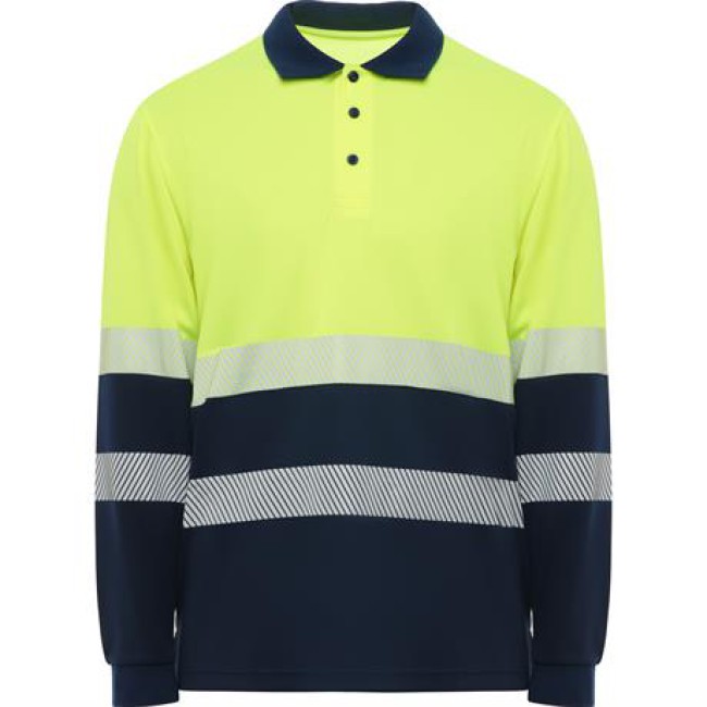 Polo tecnica ad alta visibilità a maniche lunghe.· Due bande riflettenti segmentate sul petto e sulla schiena.· Pattina con 3 bottoni a contrasto.· Colletto e polsini in maglia a costine 1x1.· Tessuto antistrappo e di facile asciugatura.· Tasca opzionale.