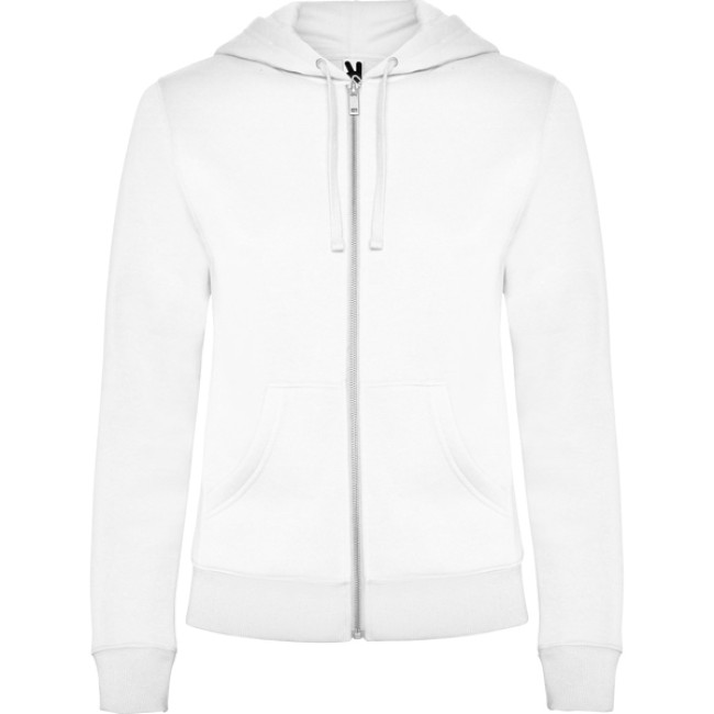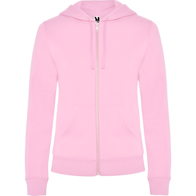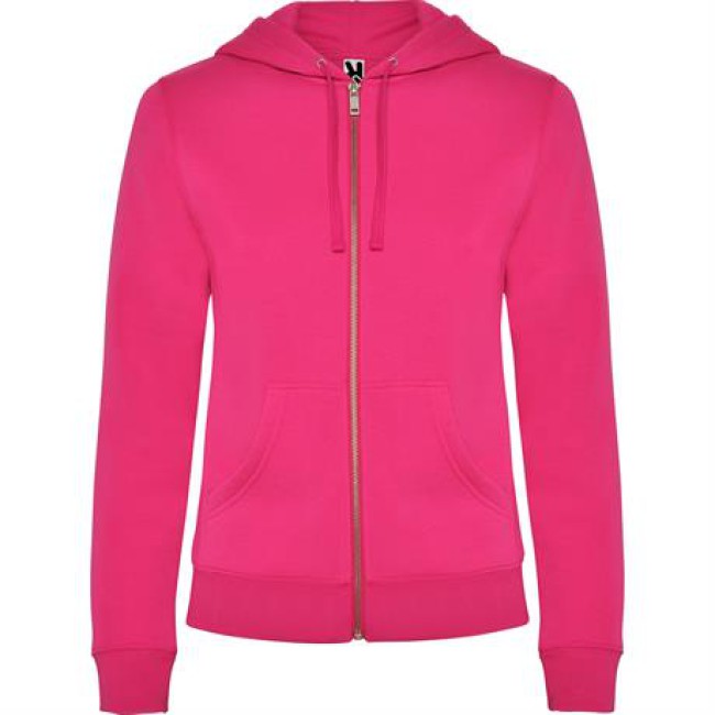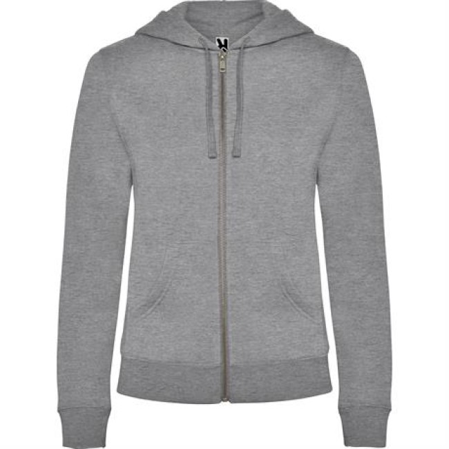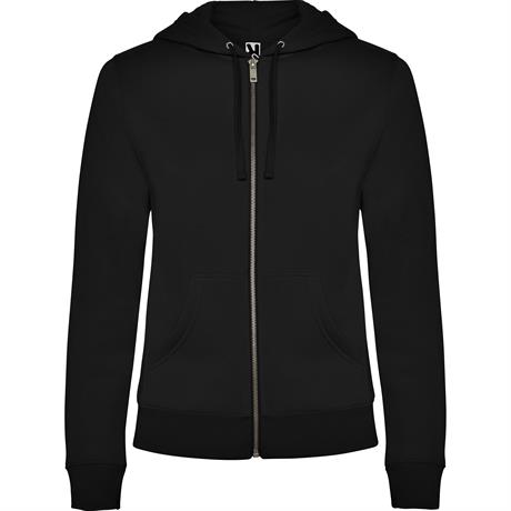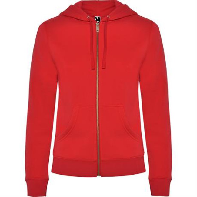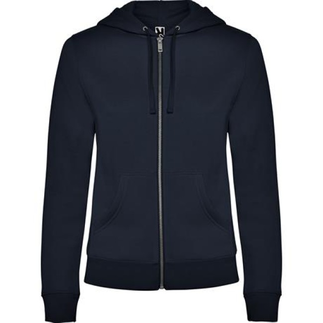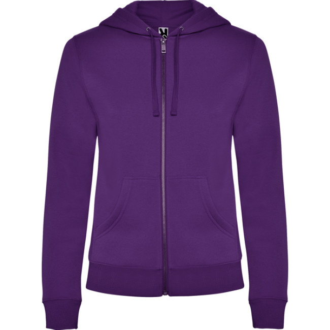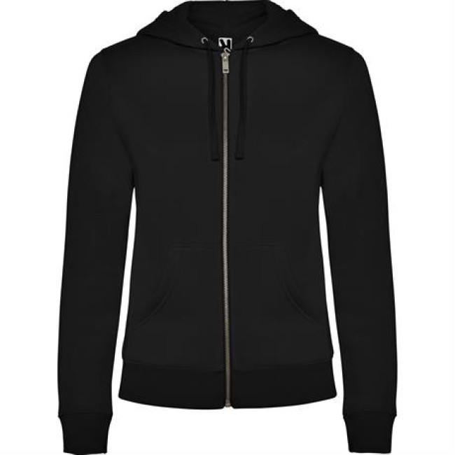 Felpa da donna con cappuccio rivestito in tinta. 1.- Cerniera metallica frontale.2.- Tasca stile canguro. 3.- Copri cuciture rinforzate all'interno del collo. 4.- Costina 2x2 nei polsini e nel girovita. 5.- Taglio aderente.