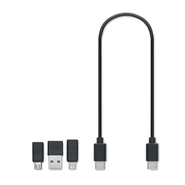 Cavo di ricarica 3 in 1 con diversi connettori. Presentato in una scatola di legno d'acacia. Cavo da Tipo-C a Tipo C, da C a USB-A, da C a micro-B, da C a Lightning.