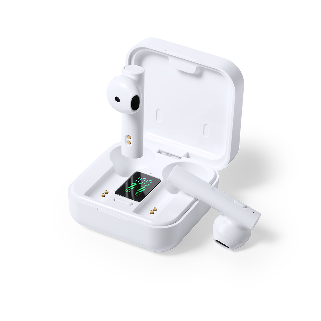 Cuffie in-ear con elegante finitura bianca e connessione Bluetooth® 5.0. Con pannello di ricarica solare integrato nel coperchio e display LCD interno con indicatore dello stato di carica. Design ergonomico, con pulsante di controllo integrato sull'auricolare, e base abbinata. Funzione vivavoce e ricaricabile con energia solare o il cavo micro USB -incluso-. Confezionate singolarmente in una custodia di alta qualità con apertura a cerniera e in scatola dal design attraente manuale di istruzioni in inglese e spagnolo.