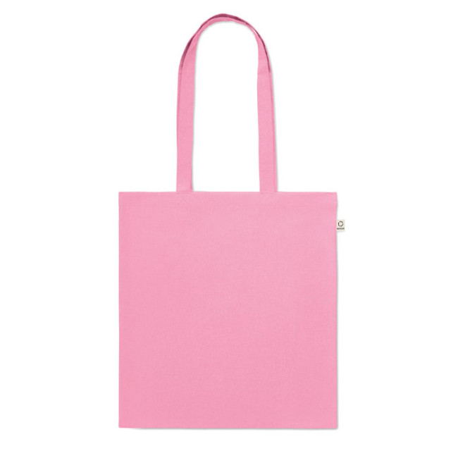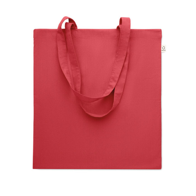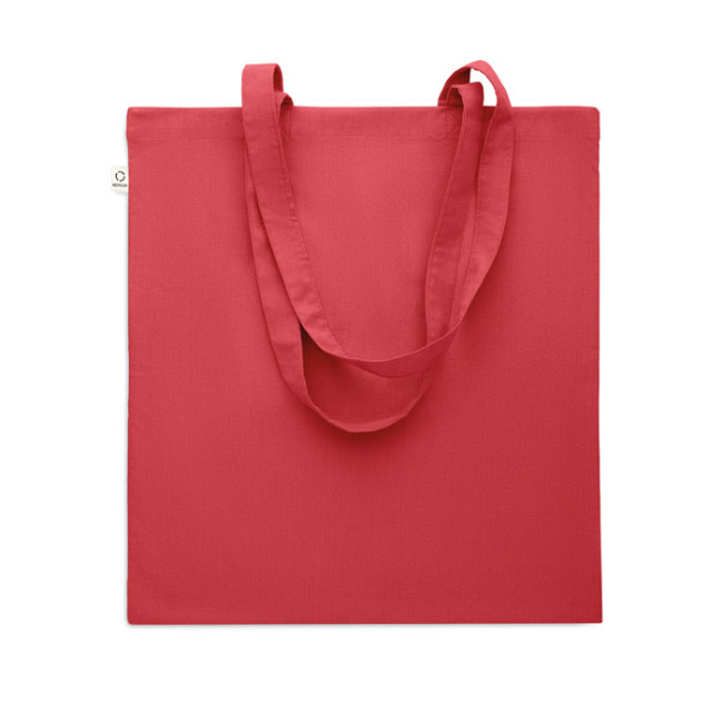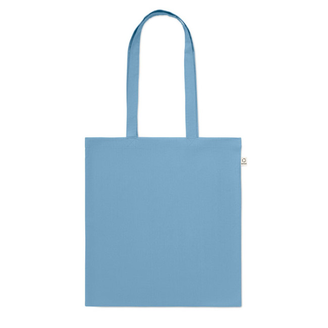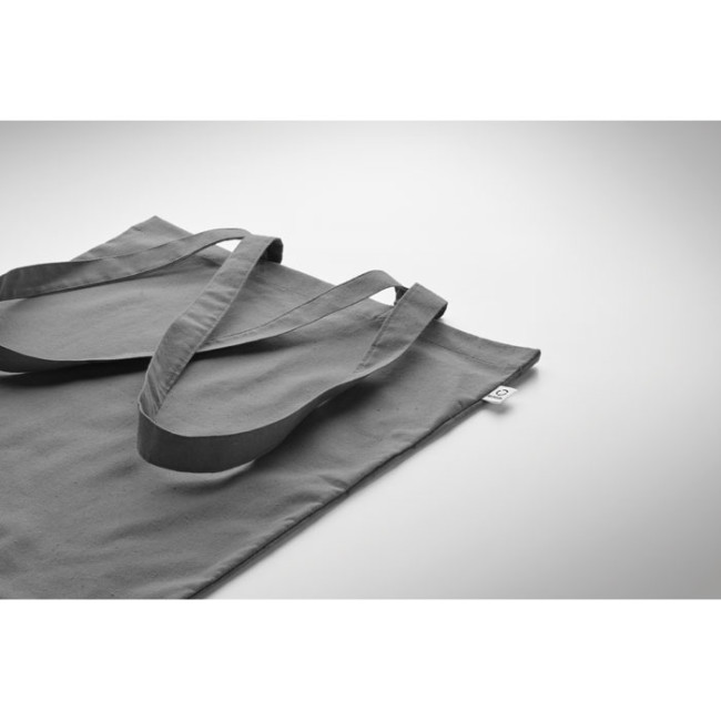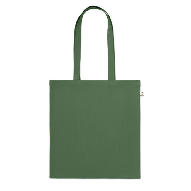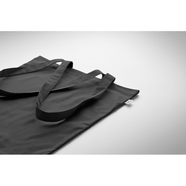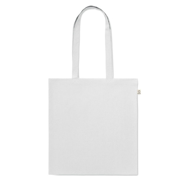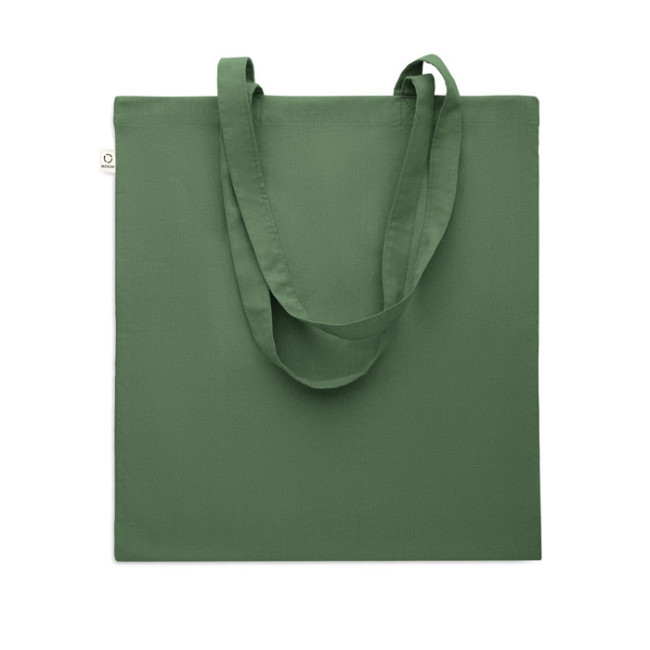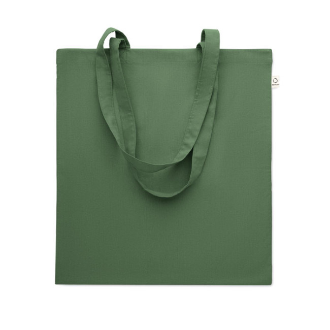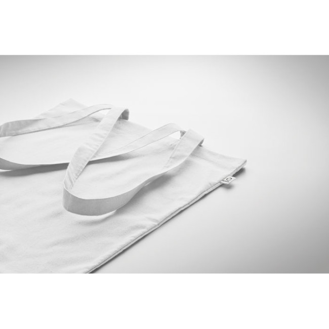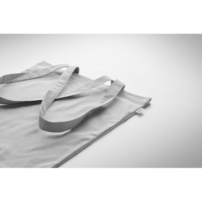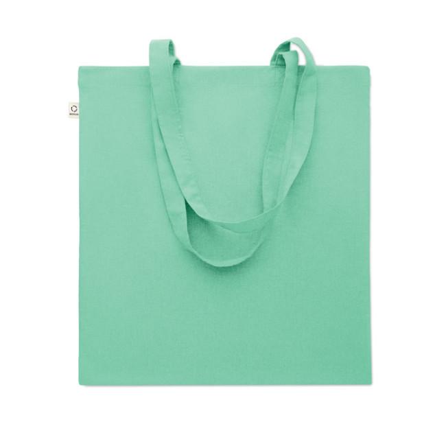 Shopper in cotone riciclato post-consumo (70% cotone riciclato e 30% RPET) con manici lunghi. 140 gr/m². Questo articolo può restringersi dopo la stampa.