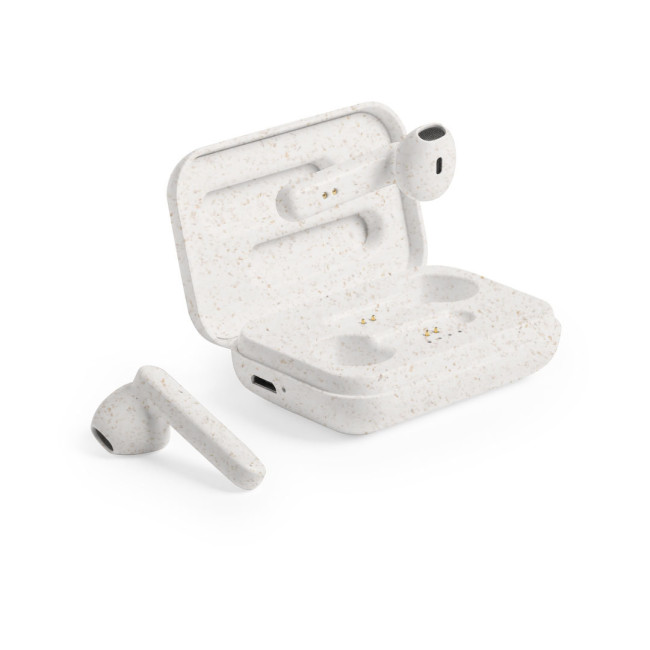 Cuffie intrauricolari della linea Nature. Connessione Bluetooth® 5.0 e rivestimento in canna di frumento, per favorire l'utilizzo di materie prime naturali e ridurre le emissioni inquinanti. Progettati ergonomicamente, includono un pulsante di controllo touch integrato nell'auricolare, con una base di ricarica abbinata e una spia di stato di ricarica a LED. Funzione vivavoce e ricaricabile, con cavo micro USB incluso. Presentato in una lussuosa valigetta individuale con coperchio incernierato e un'attraente scatola dal design ecologico.