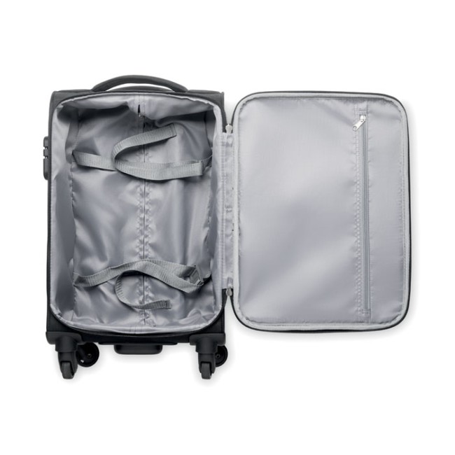 Trolley morbido in poliestere 600D RPET. Vano esterno con cerniera per laptop, tasca davanti con cerniera. Serratura combinata. Vano inferiore, telaio doppio tubo. Fodera 210D in RPET, dettagli in PU.