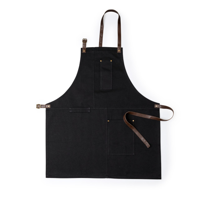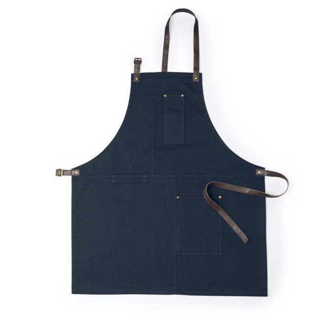 Grembiule da professionista di alta qualità in resistente tela di cotone, 340g/m2. Tagliato sotto il ginocchio, con cinturini al collo e in vita in resistente similpelle con chiusura a fibbia e rinforzo con rivetti in metallo. Include una moltitudine di tasche per diversi utensili, con cuciture rinforzate.