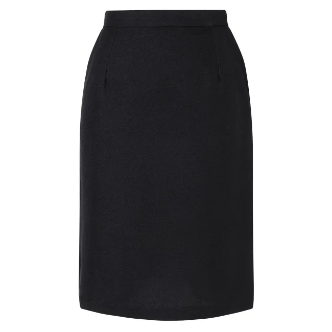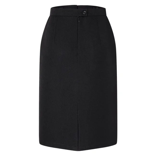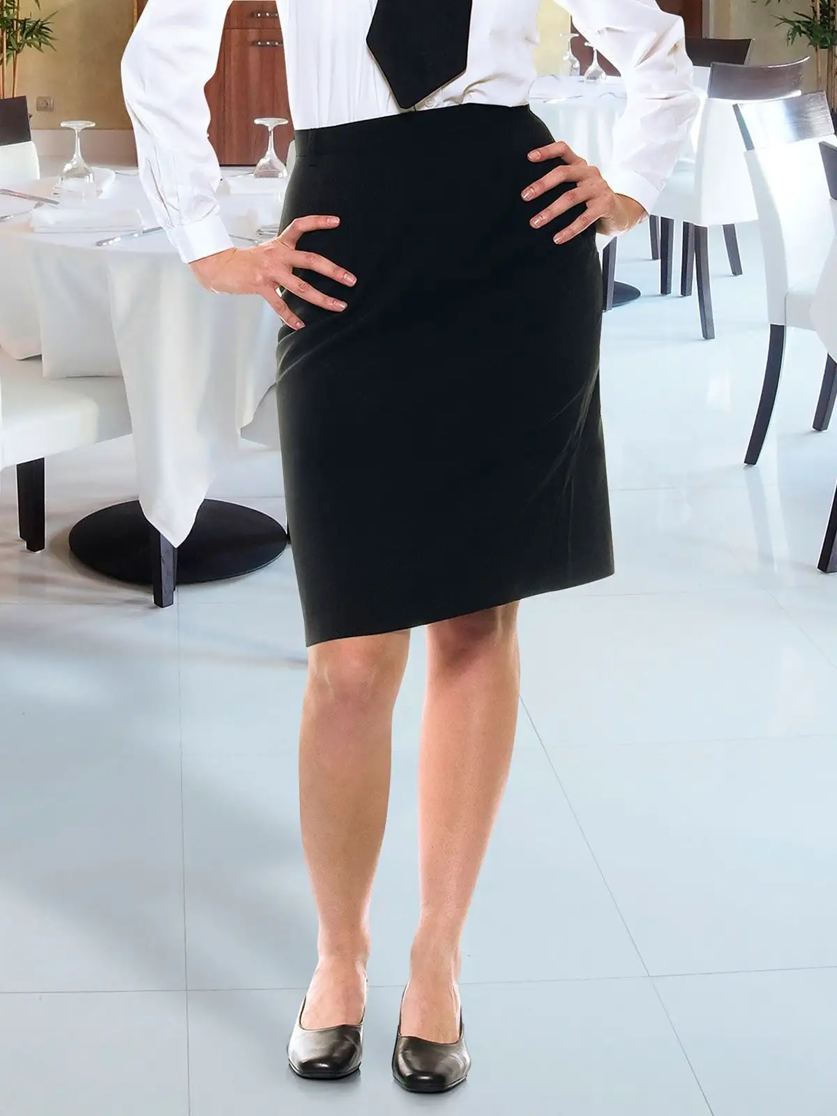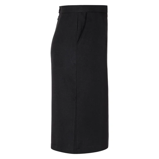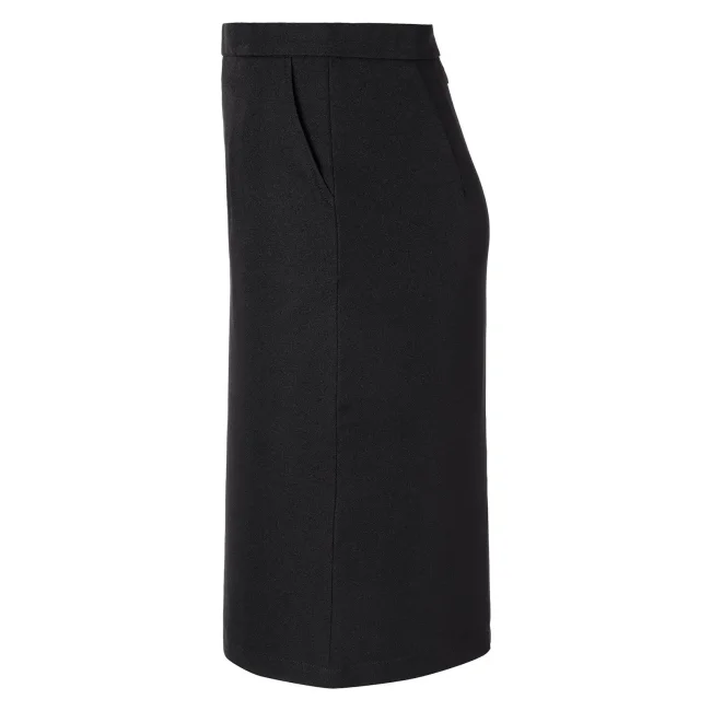 100% poliestere. Gonna da cameriera, cintura regolabile con banda elastica e bottoni, spacco di 25 cm nella parte posteriore, due tasche laterali.