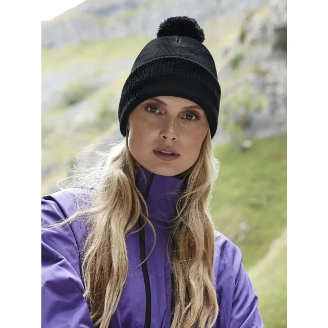100% acrilico. *Heather - 55% poliestere 45% acrilico. Fodera in micropile 100% poliestere. Cuffia con risvolto a costine e fodera in micropile, pon pon in tinta. Trattamento idrorepellente durevole. Può essere indossata con o senza risvolto. Etichetta removibile TearAway per facilitare il rebranding.