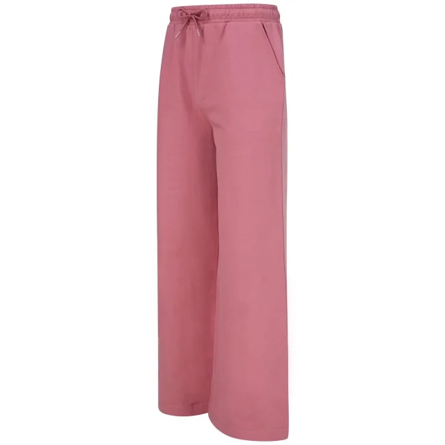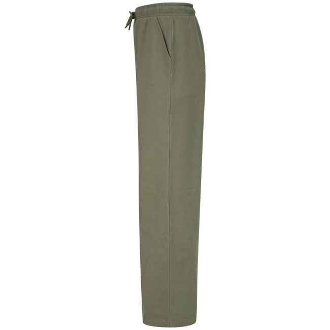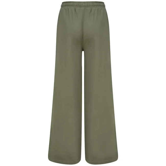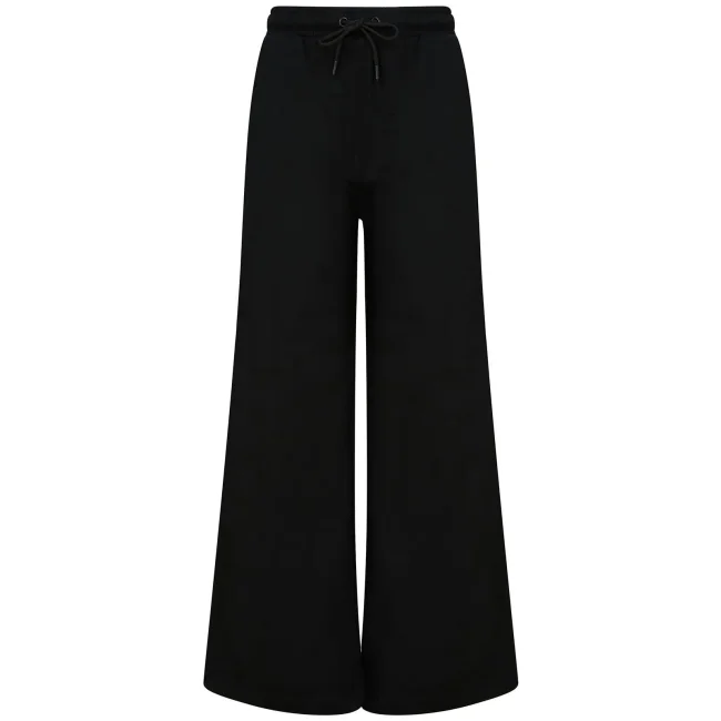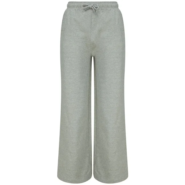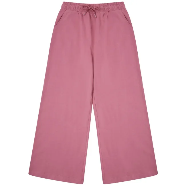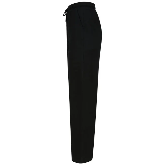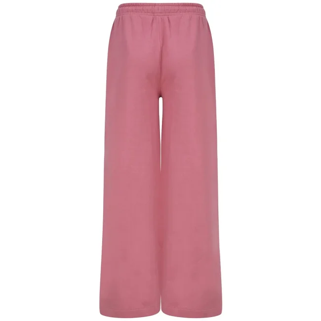 60% cotone rigenerato 40% poliestere riciclato. Pantaloni tuta da donna, gamba e fondo ampi, felpati internamente. Vita elasticizzata con cordino tondo, due tasche laterali, cuciture in tono. Etichetta senza brand. Busta riutilizzabile 100% plastica riciclata.
