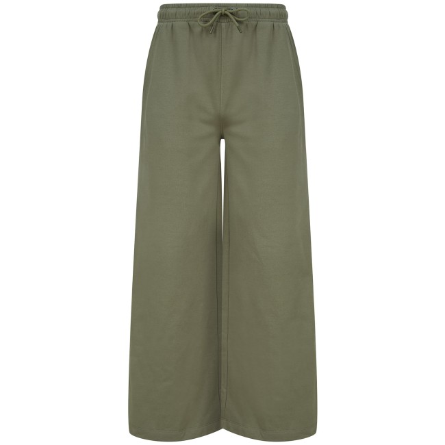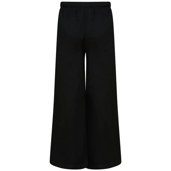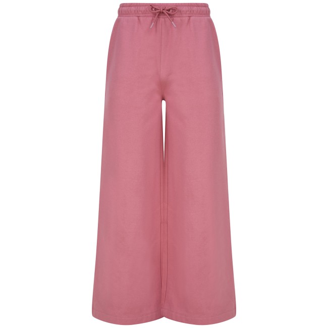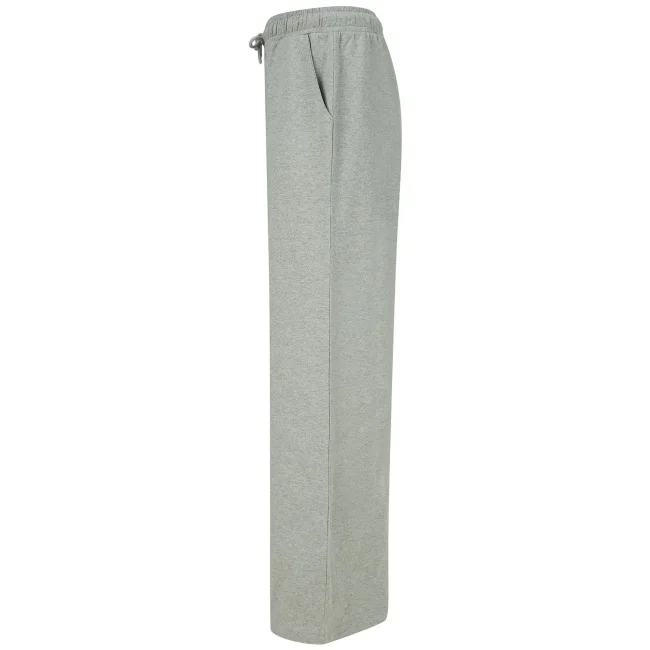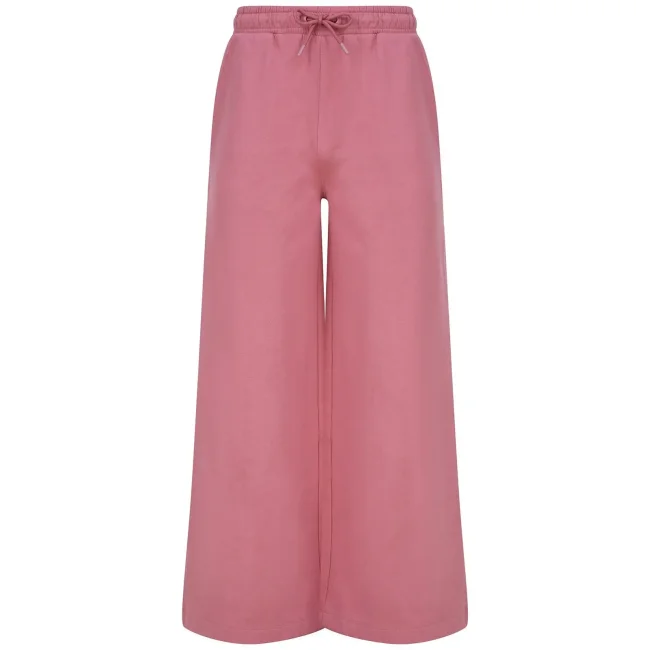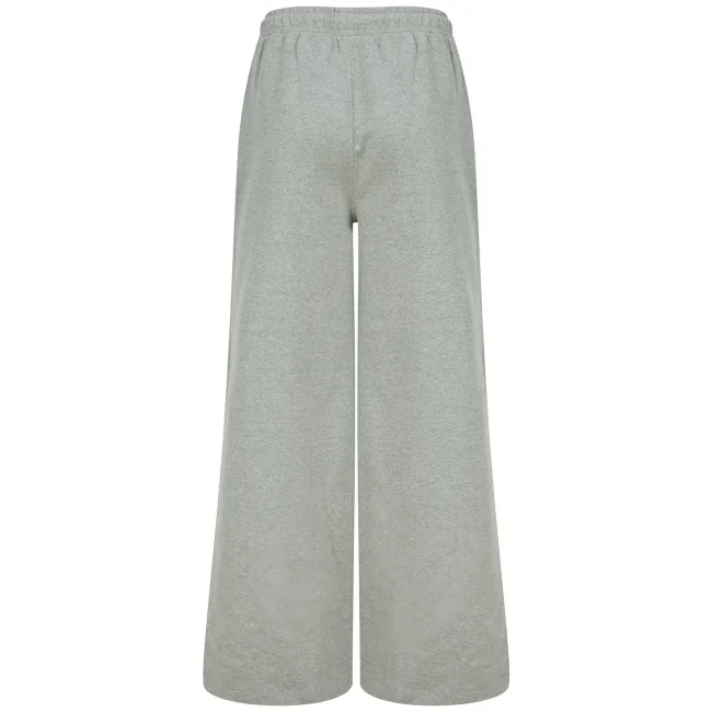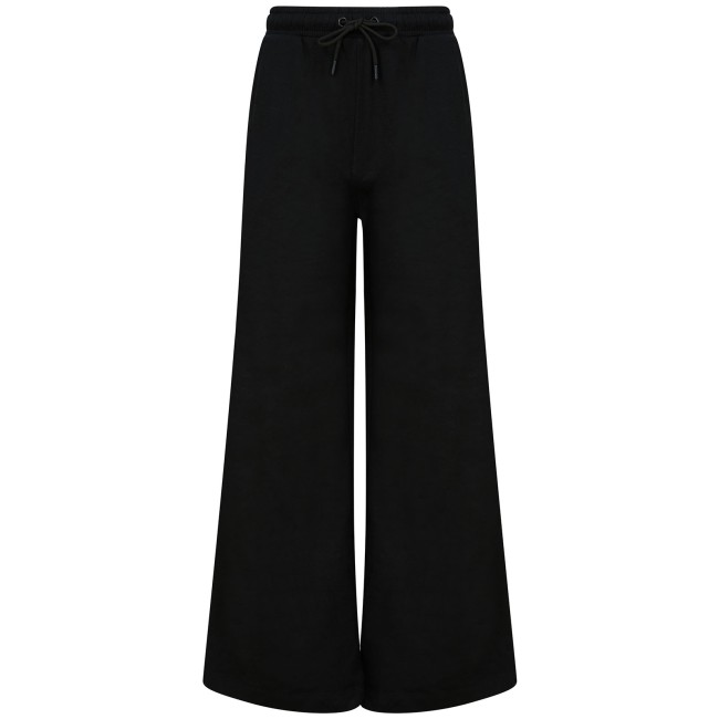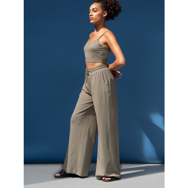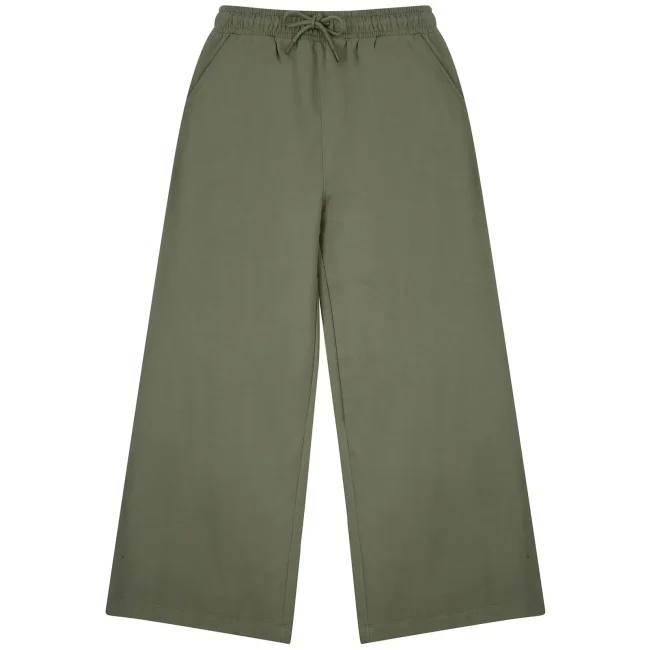 60% cotone rigenerato 40% poliestere riciclato. Pantaloni tuta da donna, gamba e fondo ampi, felpati internamente. Vita elasticizzata con cordino tondo, due tasche laterali, cuciture in tono. Etichetta senza brand. Busta riutilizzabile 100% plastica riciclata.