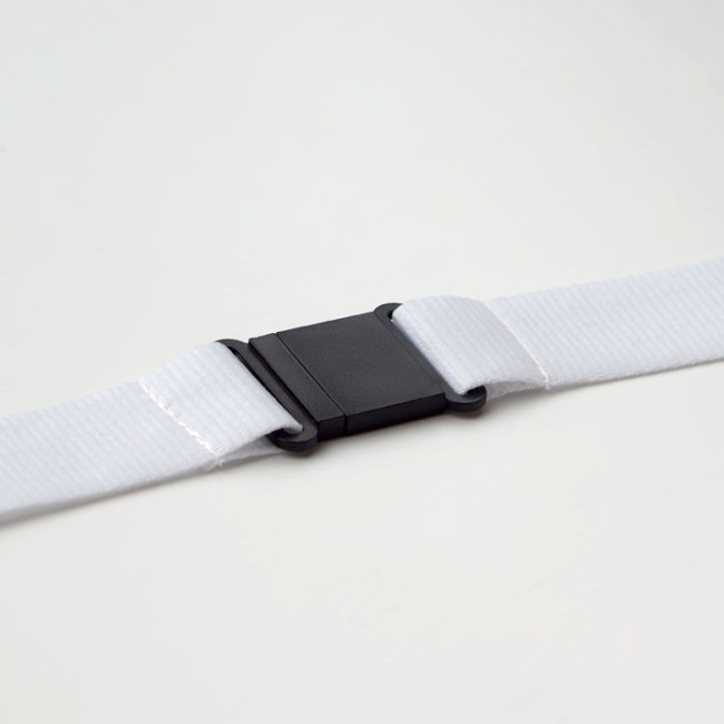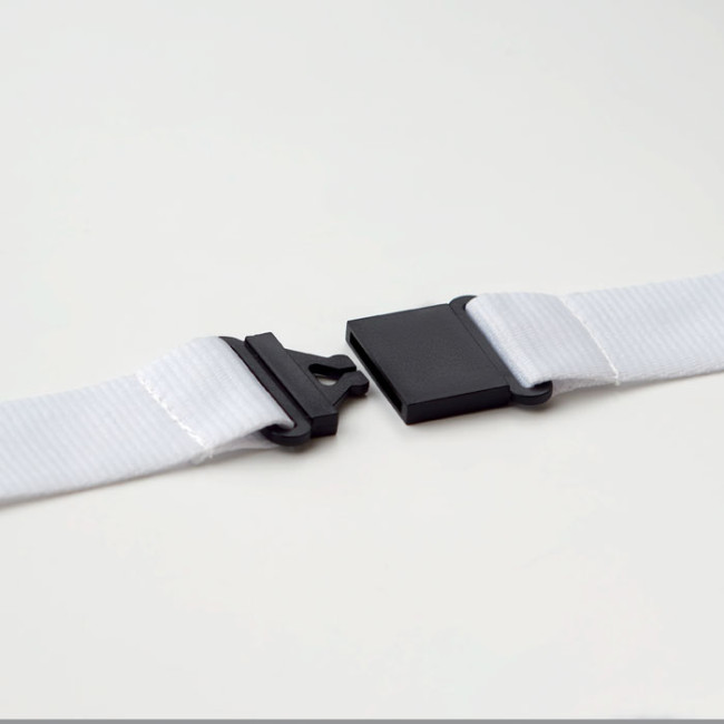 Lanyard con gancio in metallo, fibbia staccabile e chiusura di sicurezza. 25 mm di larghezza. Stampa in sublimazione disponibile sono sull’articolo di colore bianco.