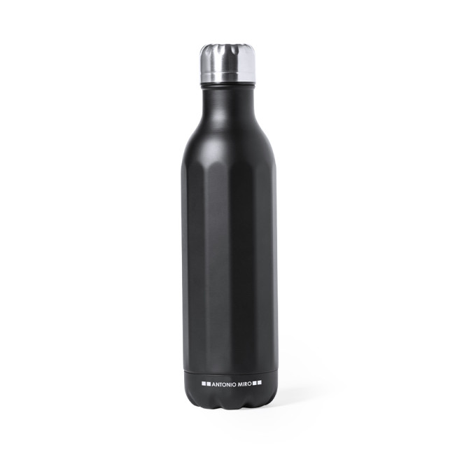 Borraccia in acciaio inossidabile Antonio Miró. Con una capacità di 750 ml e una sobria finitura nera satinata, con corpo a prisma e logo Mirò sulla base. Con tappo a vite cromat. Confezionata in una scatola dal design accattivante con il logo Mirò.