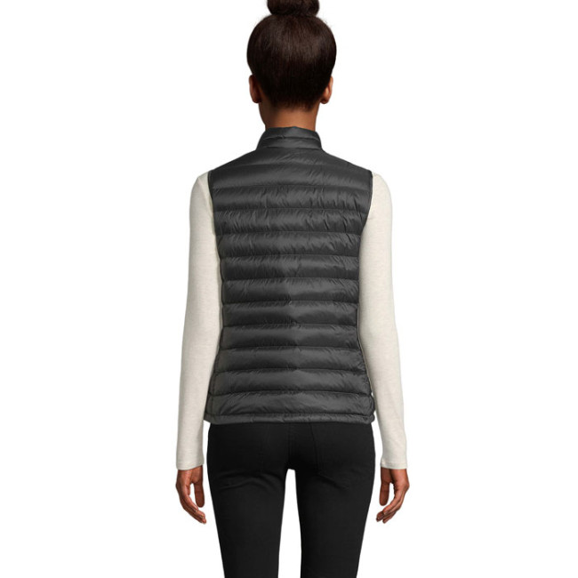 SOL'S WILSON BW DONNA. Piumino leggero da donna in piuma. Tessuto esterno e fodera: 100% poliammide. Imbottitura 60% Sorona 40% poliestere riciclato. POLIAMMIDE 380T, Apertura con zip, 2 tasche anteriori con zip, 2 tasche interne, Colletto piccolo e alto, Taglio aderente, Sistema di ripiegamento ''In bag'' con stopper. OEKO-TEX®. Venduto solo con stampa.