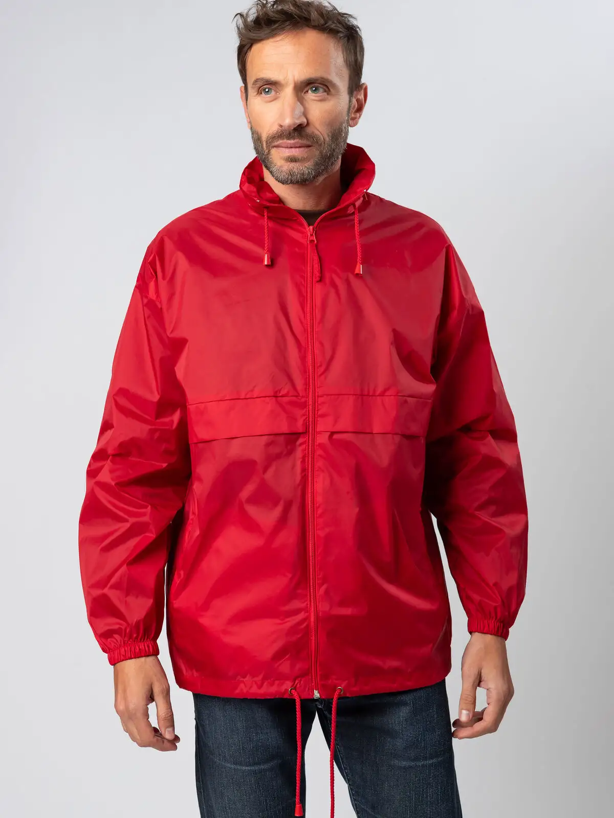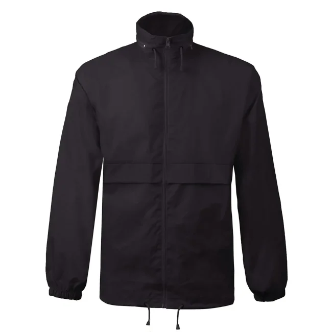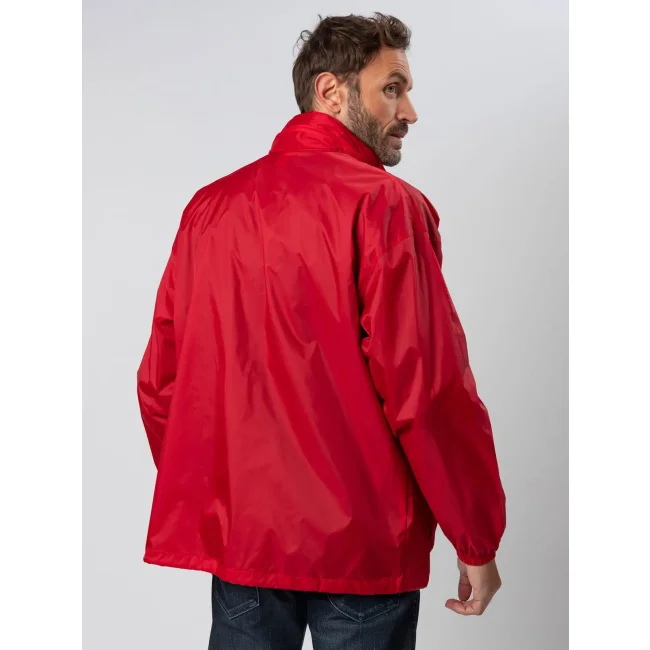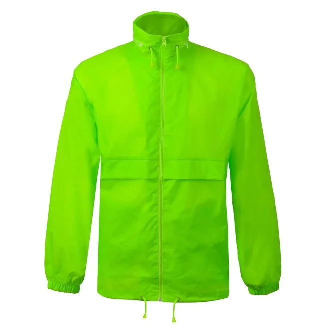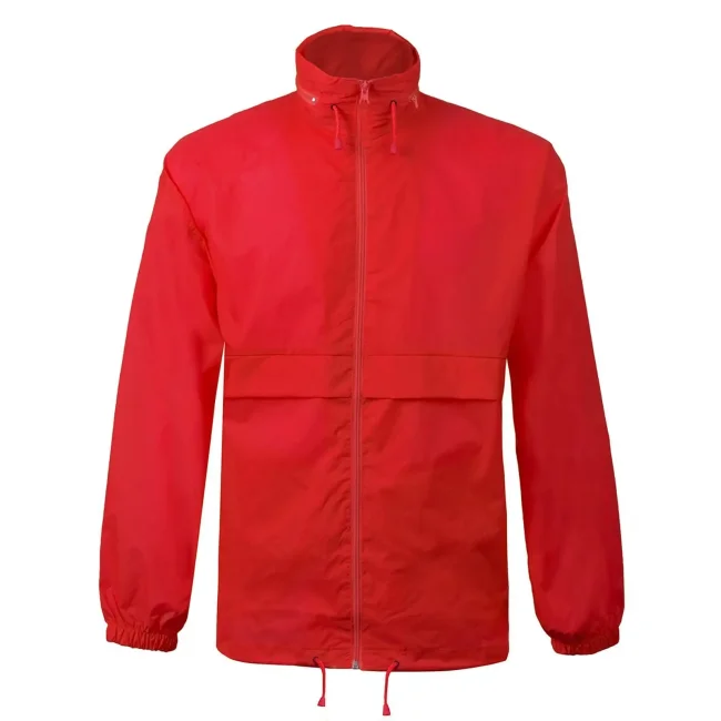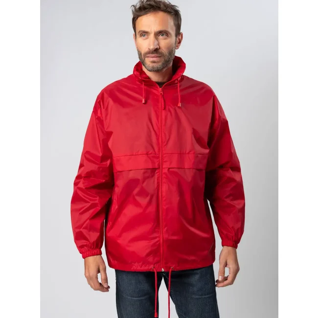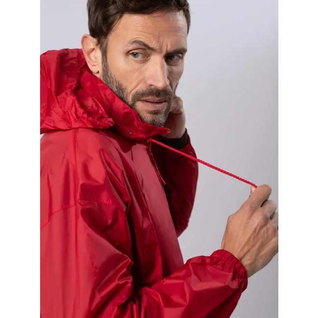 100% nylon. Giacca antivento unisex con cappuccio a scomparsa richiudibile nella tasca. Due tasche esterne con chiusura a zip, zip intera tono su tono, polsini con elastici, cordoncino in vita, fori di areazione.
