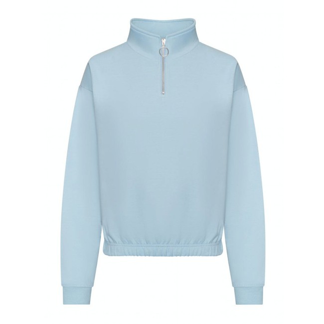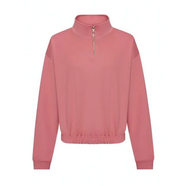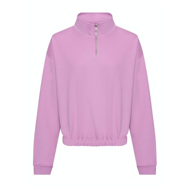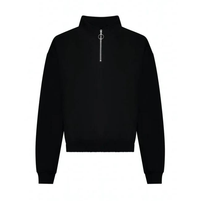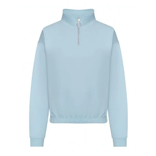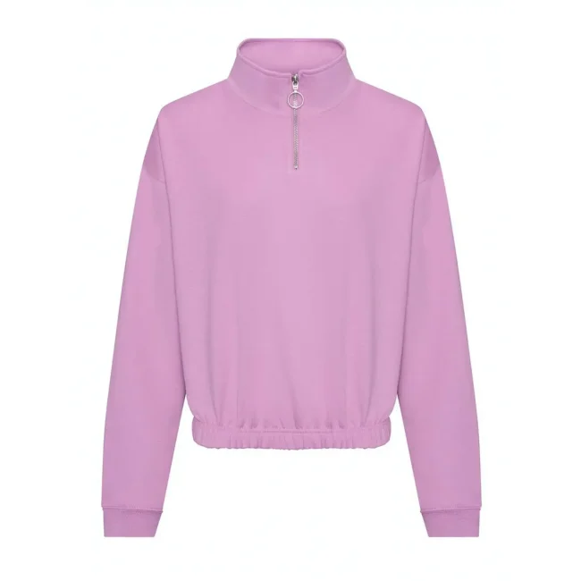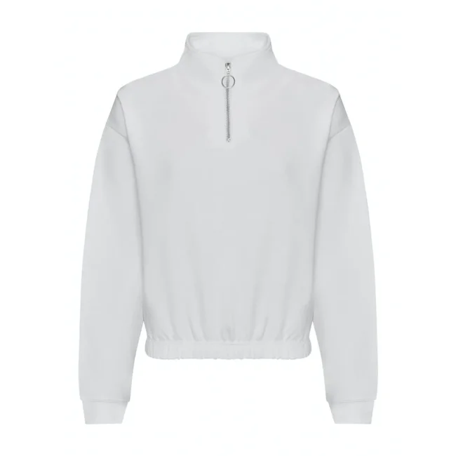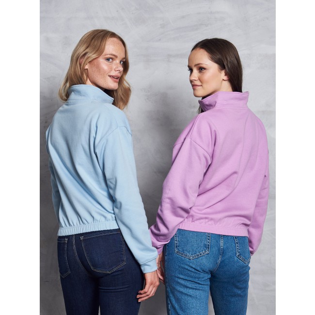 80% cotone 20% poliestere. Felpa corta zip ¼, felpata internamente, taglio femminile. Collo alto, orlo elastico, polsini a costine. Tessuto morbido sul davanti per una superficie di stampa ideale. Etichetta tear-away ideale per il rebranding.