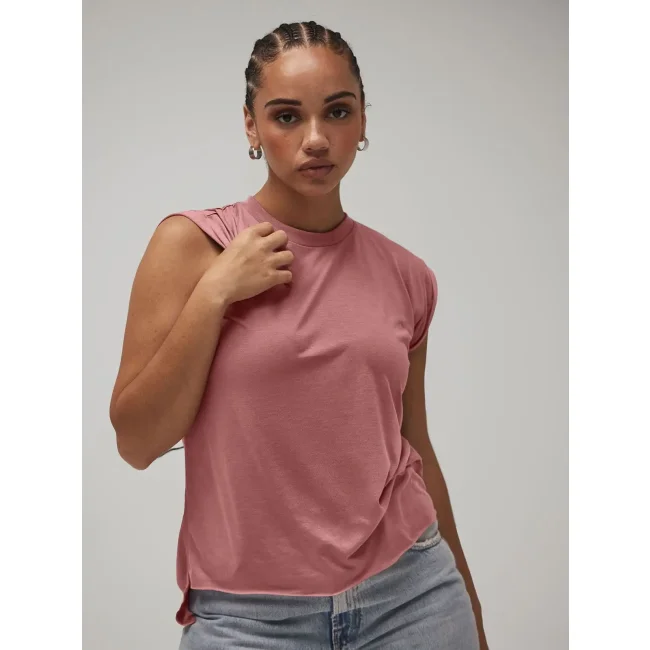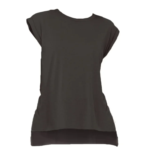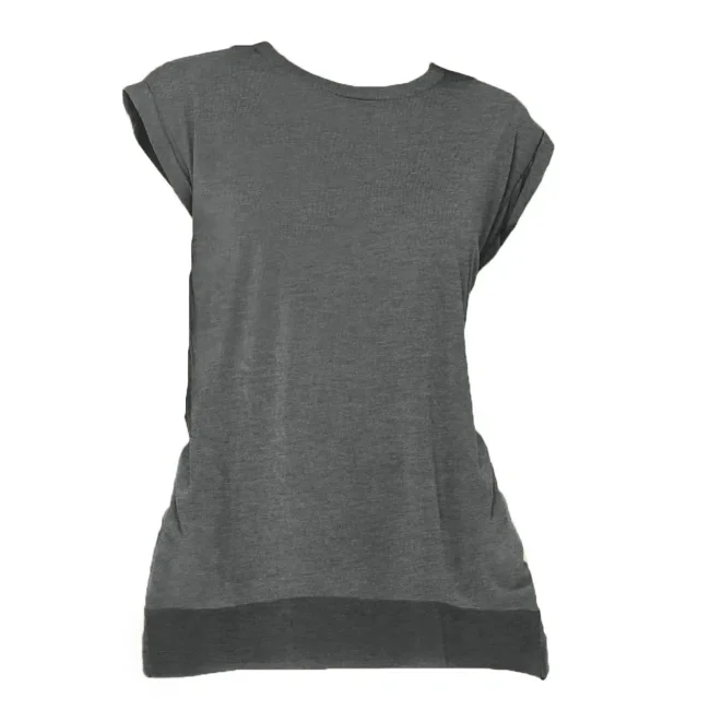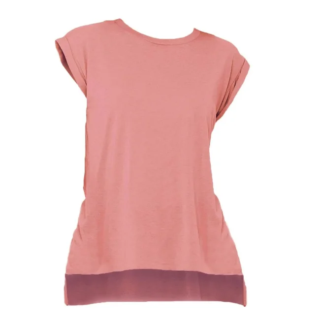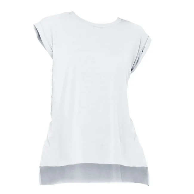65% poliestere, 35% viscosa. T-shirt manica corta, girocollo, giromaniche con orlo arrotolato, parte posteriore più lunga. Struttura con cuciture laterali. Etichetta removibile.
