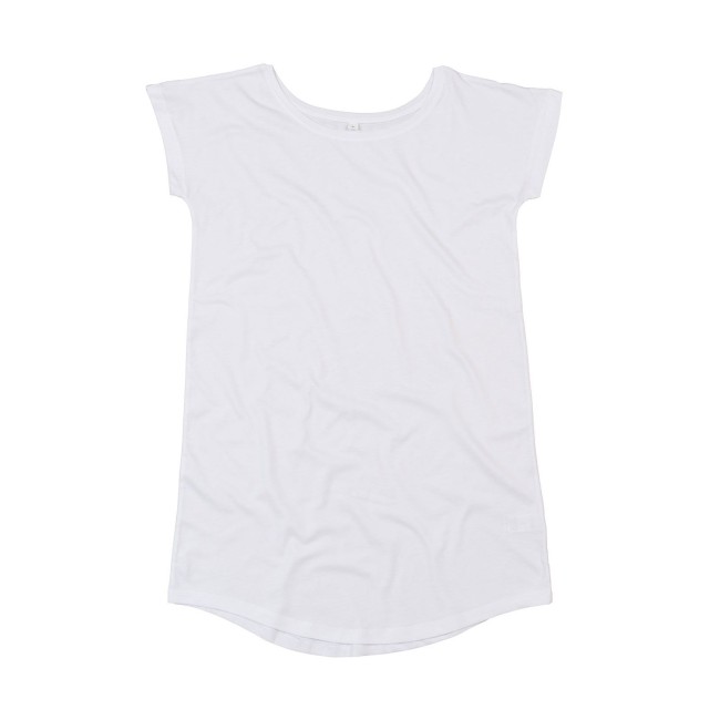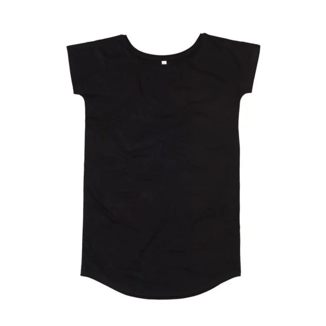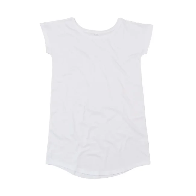 100% cotone organico single jersey. Vestito manica corta, leggermente sfiancato, taglio extralungo, orlo arrotondato, girocollo profondo, etichetta strappabile, struttura con cuciture laterali.