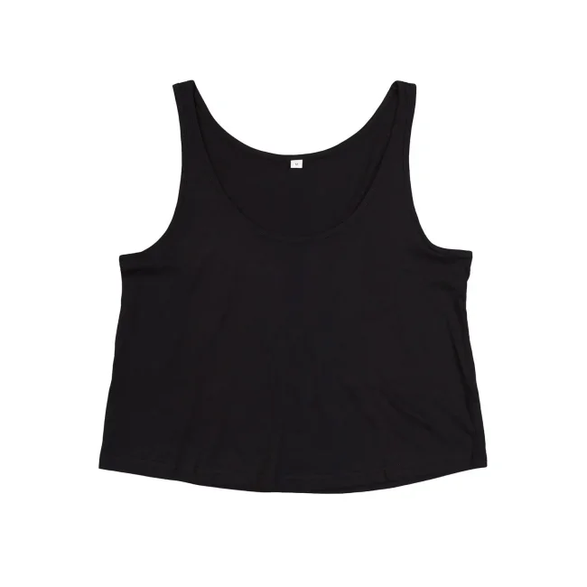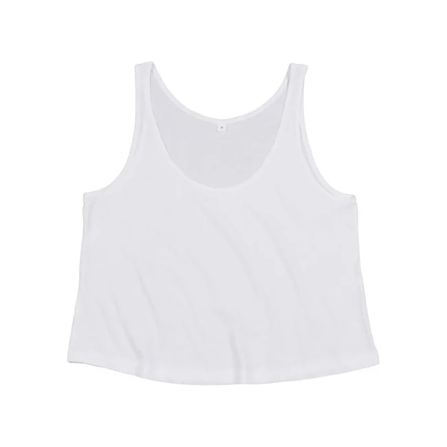 100% cotone organico single jersey. Canotta girocollo profondo, extra corta, spalline larghe, bordino sottile su girocollo e giromanica, orlo con cucitura a doppio ago, etichetta strappabile. Struttura con cuciture laterali.
