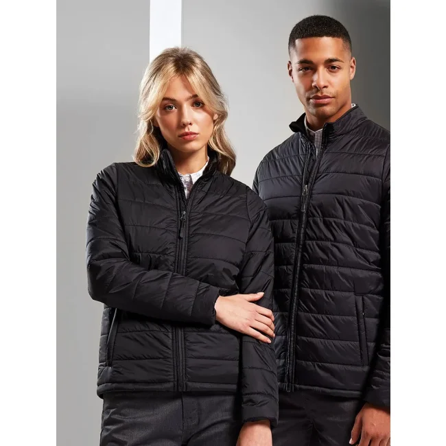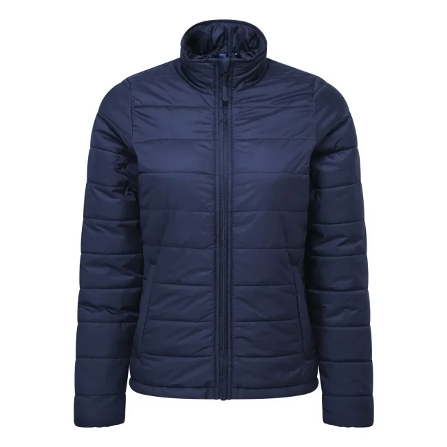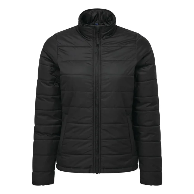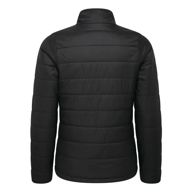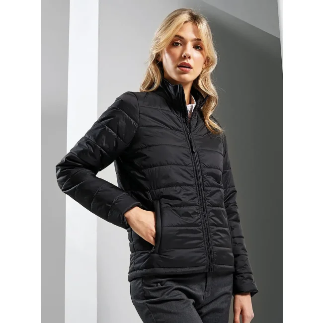 100% nylon riciclato, fodera e imbottitura 100% poliestere riciclato. Giacca da donna imbottita, leggera e impermeabile, con cuciture orizzontali, tasche laterali con cerniera, accesso completo all'intera giacca per personalizzazioni e ricami, puo' essere ripiegata nella sua sacca.