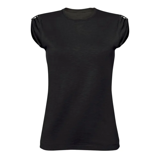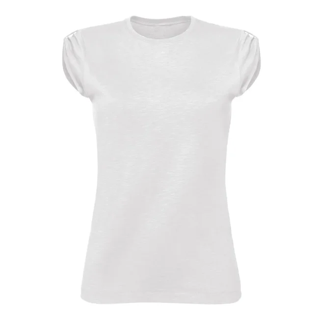 100% cotone . T-shirt taglio femminile con manica corta raccolta sulla spalla, girocollo basso, tessuto slub ring-spun single jersey. Etichetta strappabile.