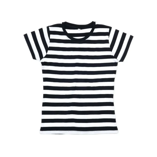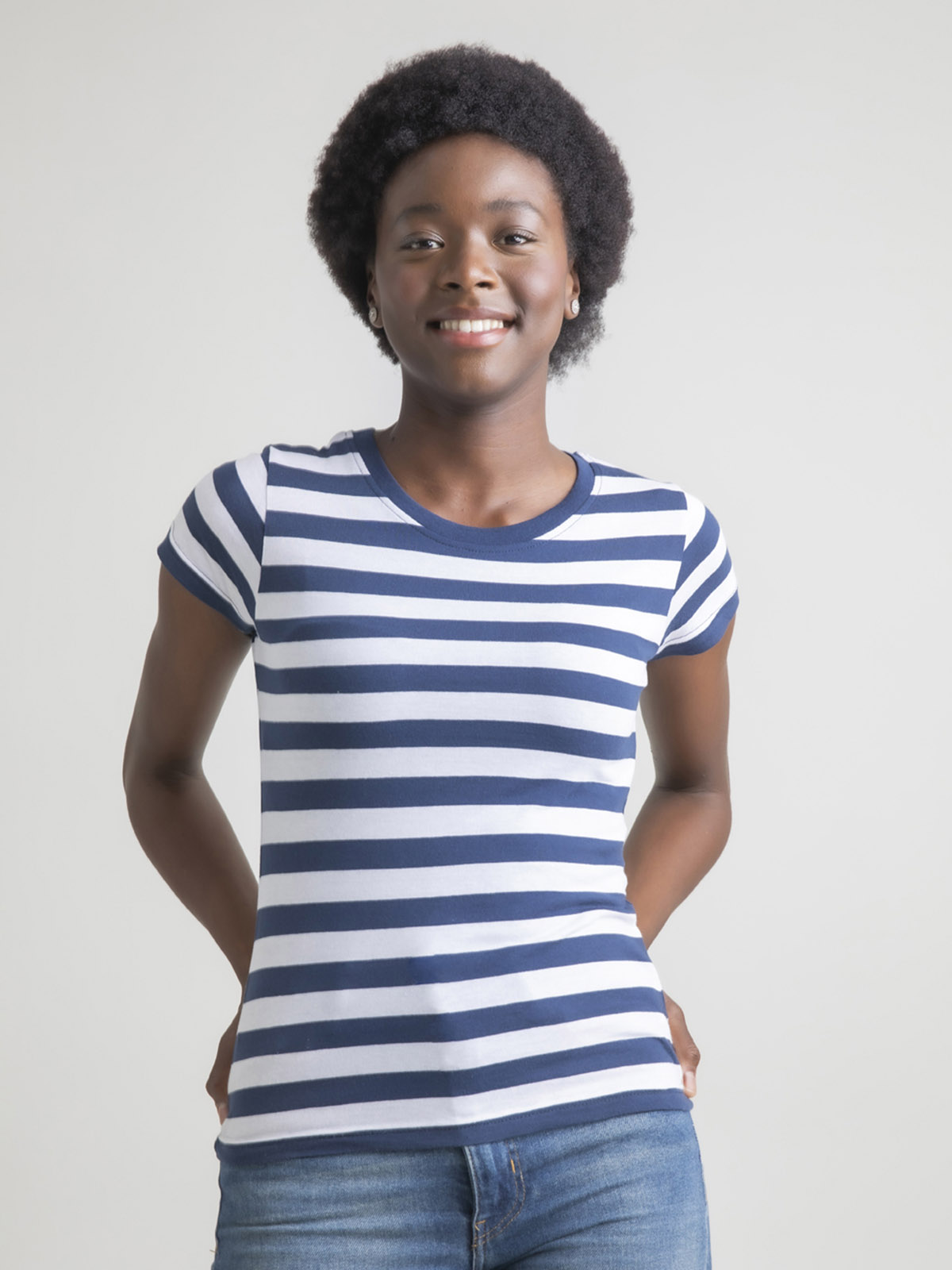100% Cotone. T-shirt in jersey a girocollo, tinta in filo con stampa a righe. Cucitura a doppio ago. Leggermente sfiancata.