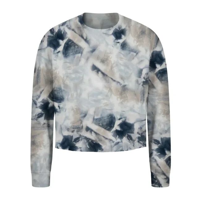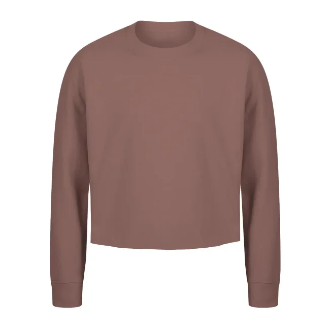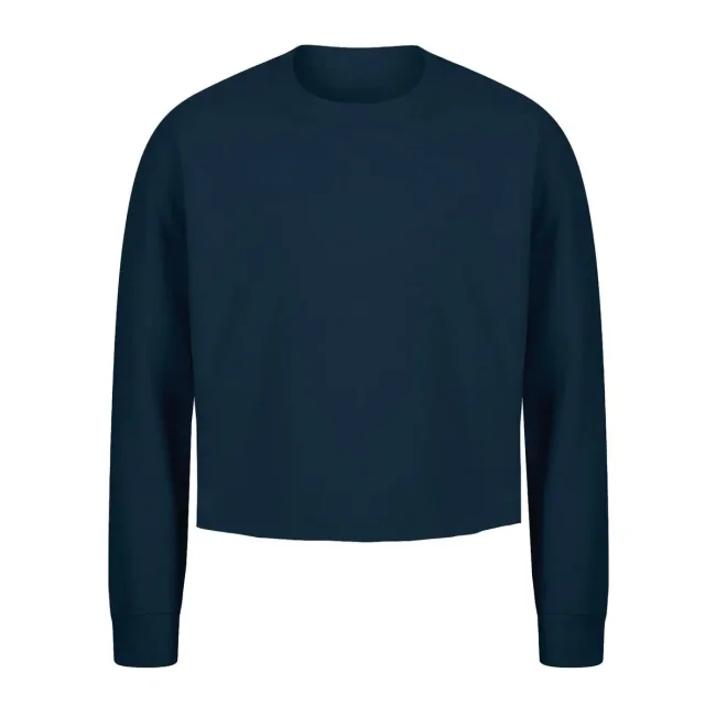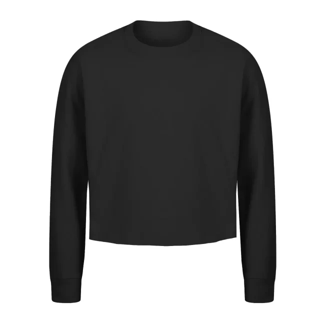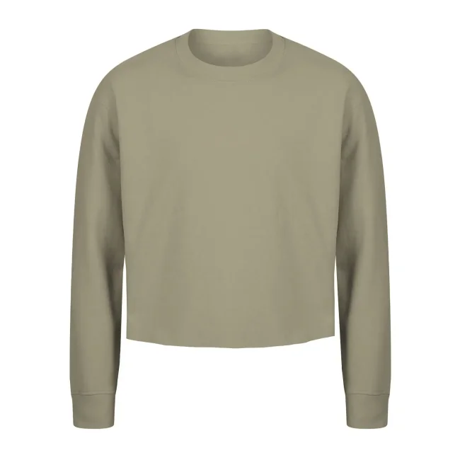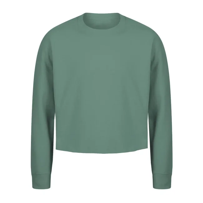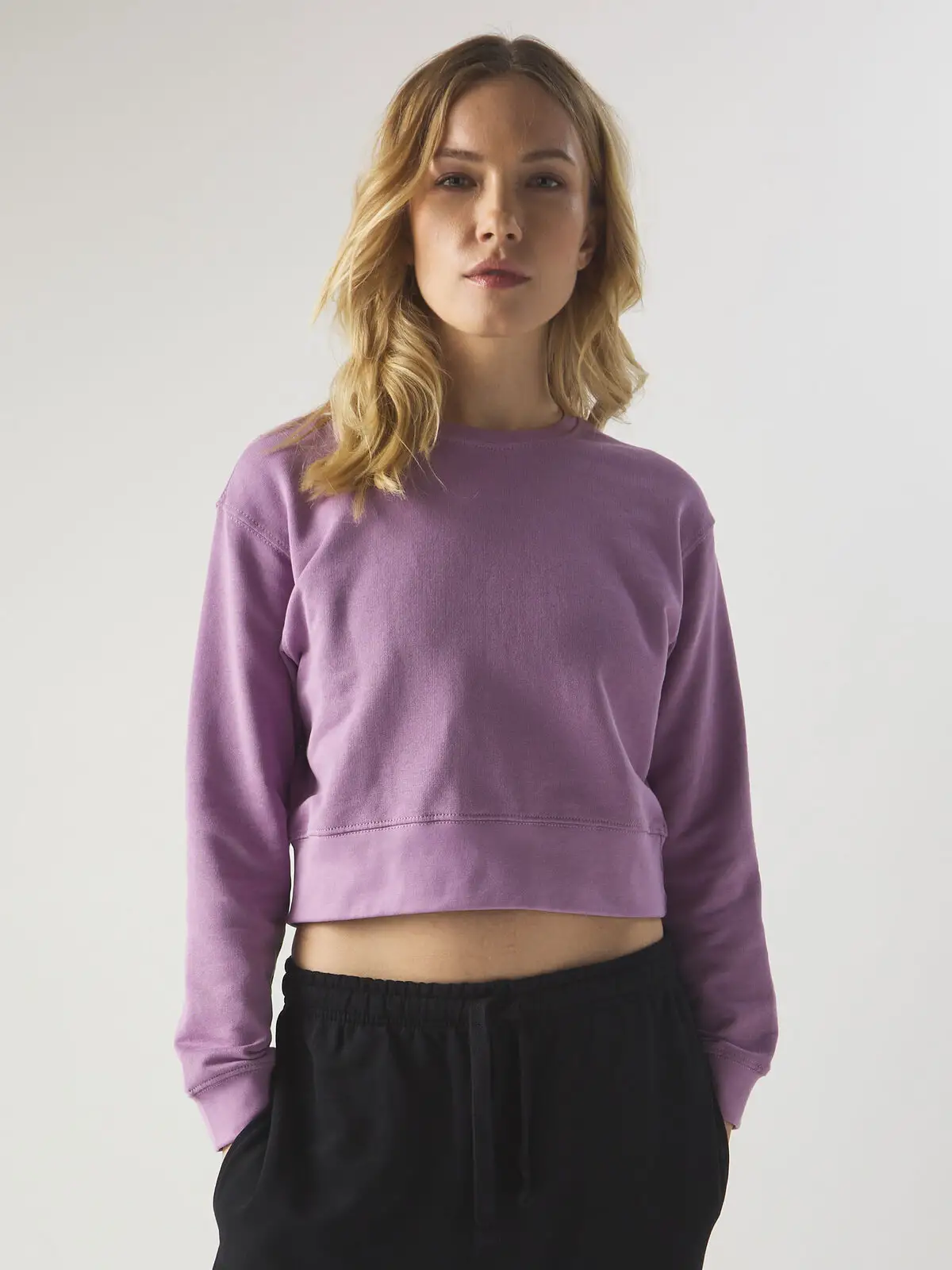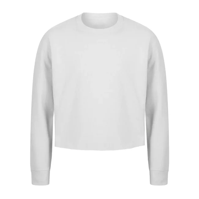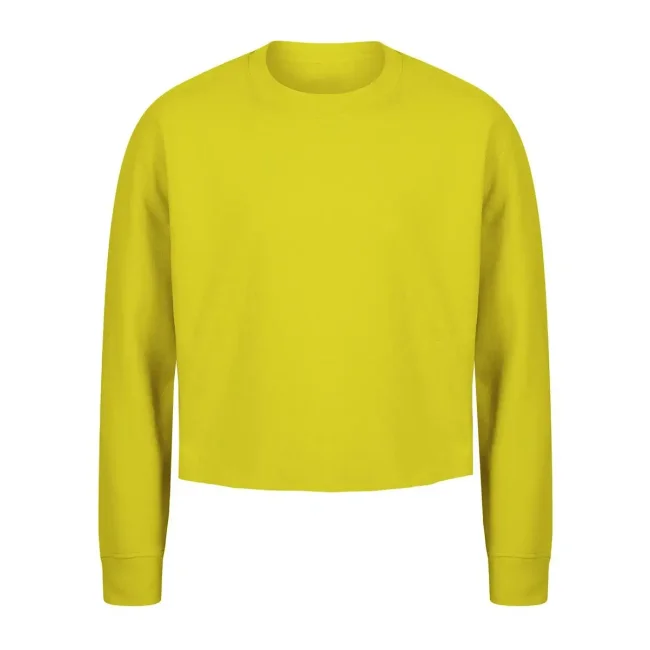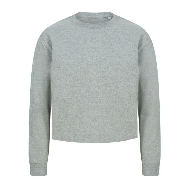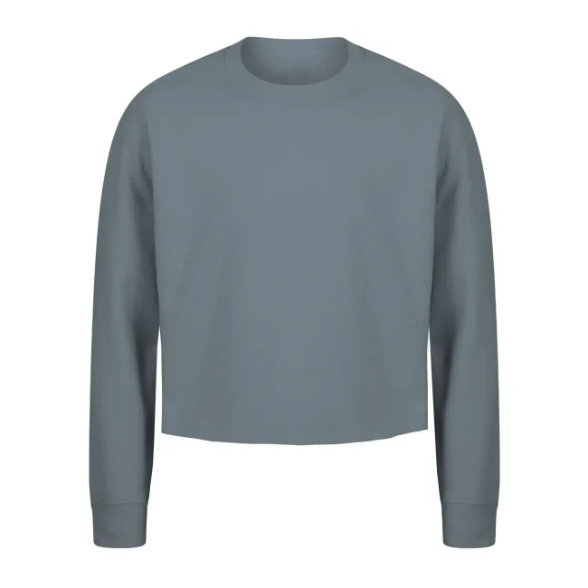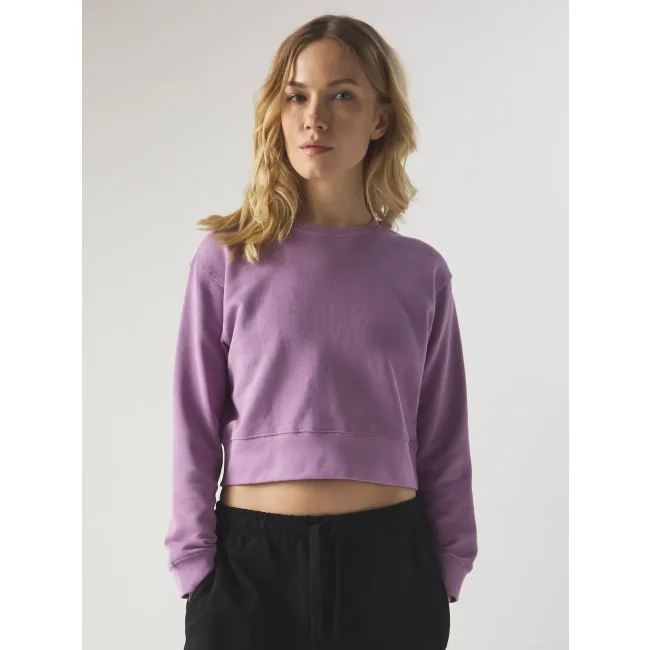 100% cotone. Felpa girocollo crop donna in french terry, cotone pettinato 3 fili, struttura con cuciture laterali, nastro di rinforzo nel colletto fascia in vita e polsini in costina, etichetta strappabile. Composizione Grey Heather: 93%Cot 7%Pol.