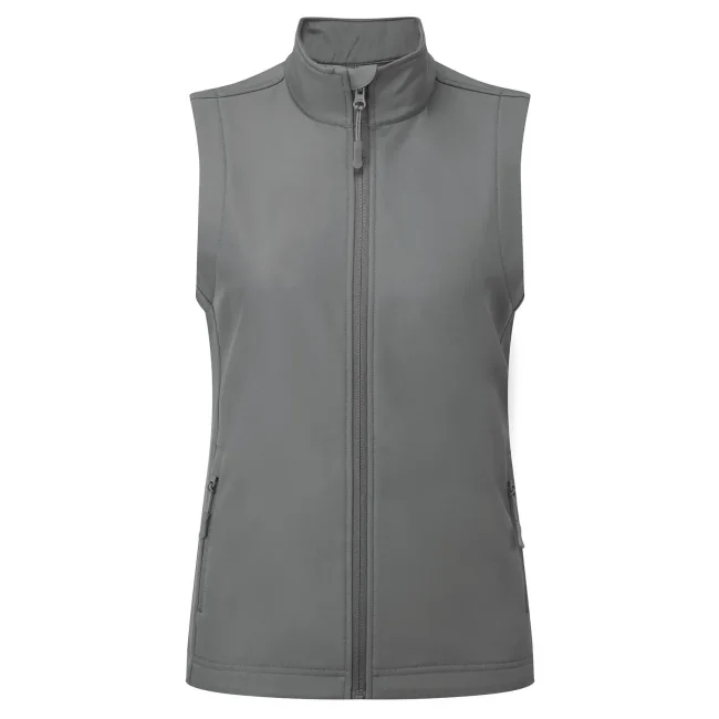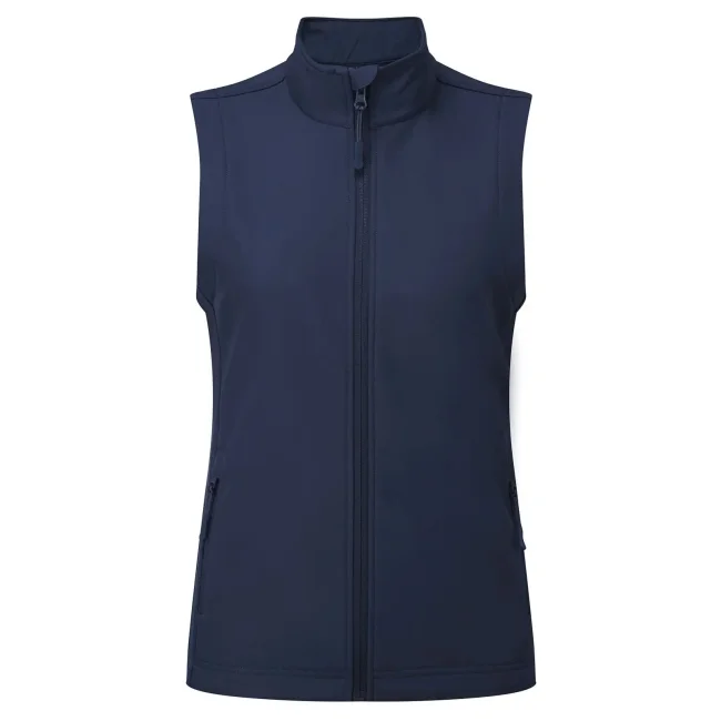 100% poliestere riciclato. Gilet softshell da donna a due strati con interno in pile, tasche laterali con cerniera, colletto rialzato, tessuto impermeabile e antivento, coulisse elasticizzata sull'orlo, due tasche interne, adatto a ricamo, transfer e serigrafia.