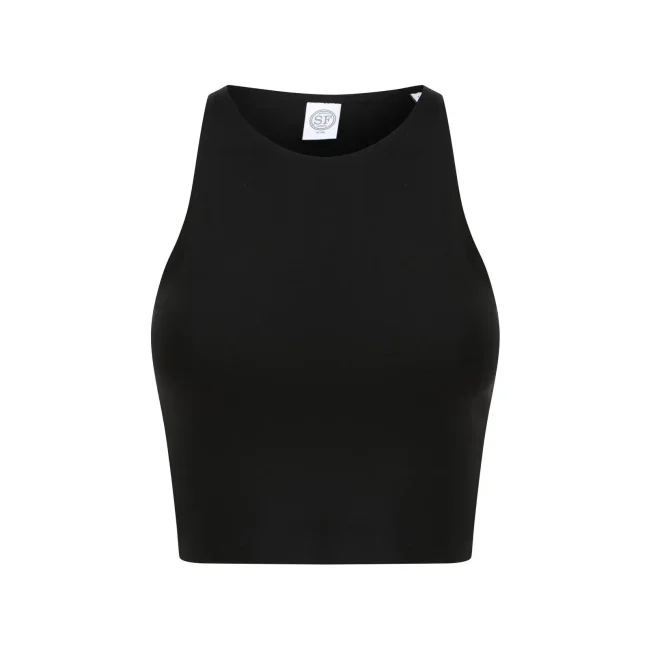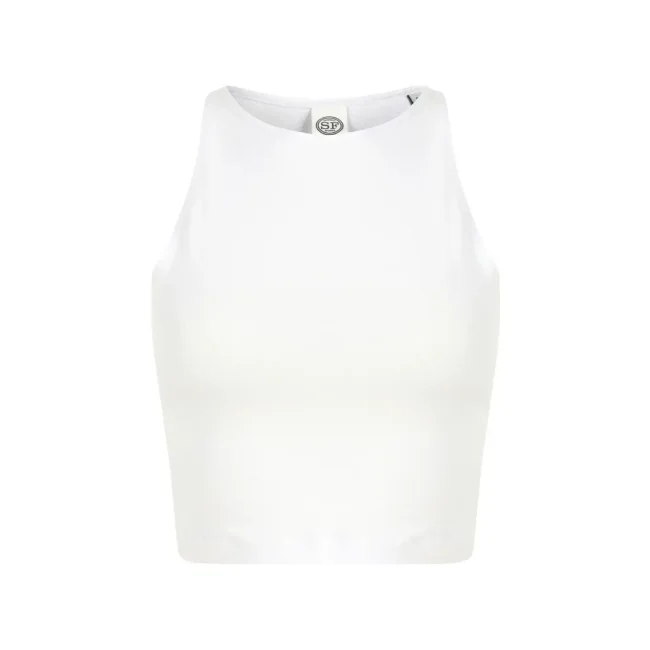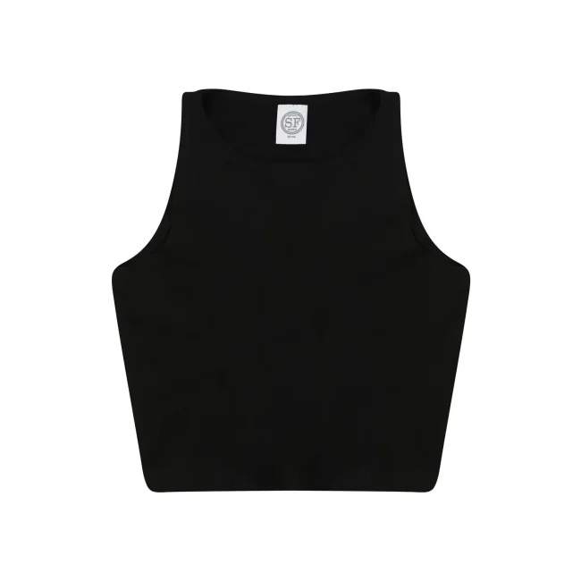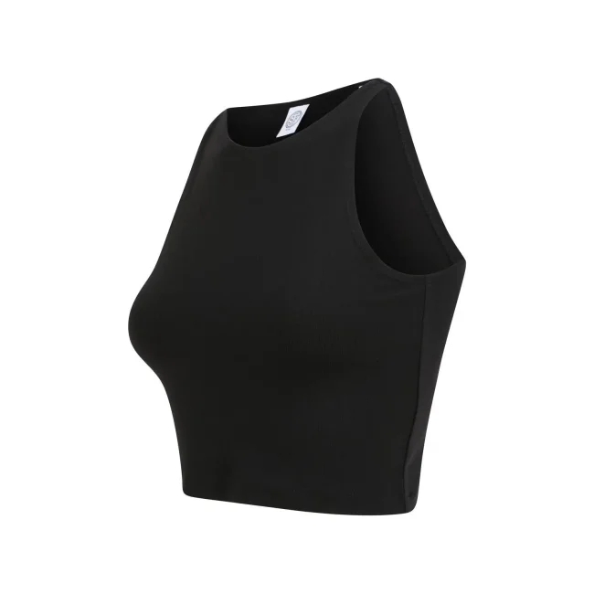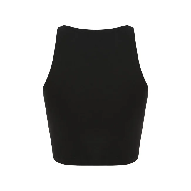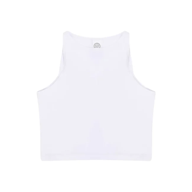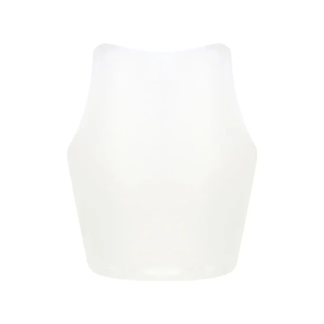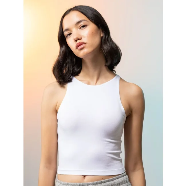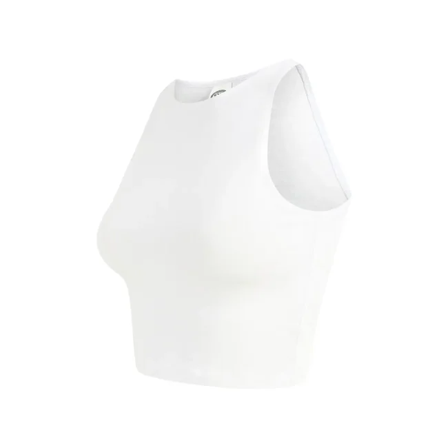 93% cotone, 7% poliestere. Top corto single jersey, scollo a vogatore su fronte e retro, doppie cuciture su orlo, colletto e maniche, etichetta strappabile. Non lavare con ammorbidente e asciugare lontano da luce del sole o fonti di calore dirette.