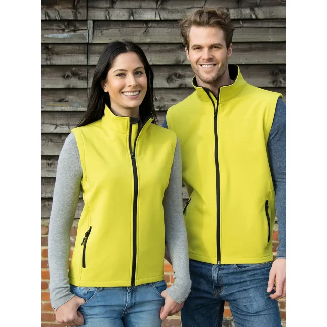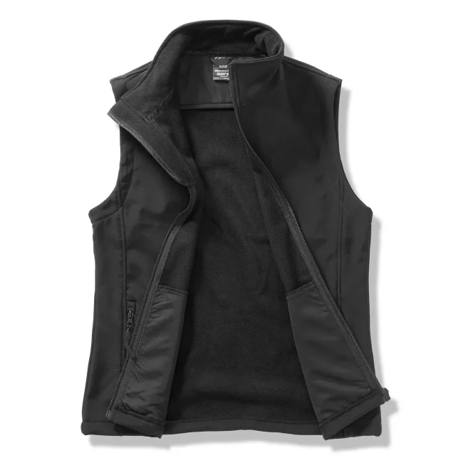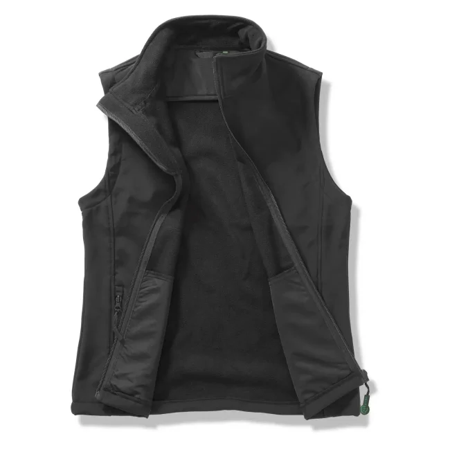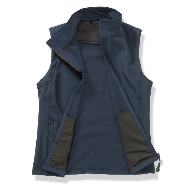 100% poliestere. La composizione del prodotto è in fase di conversione al polistere riciclato. Si prega di notare che è in corso la transizione delle giacenze. Giacca smanicata in softshell a due strati, con interno in micropile, antivento e traspirante, zip frontale con protezione per il mento YKK, tasche laterali con cerniera.