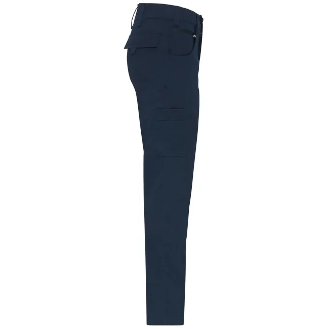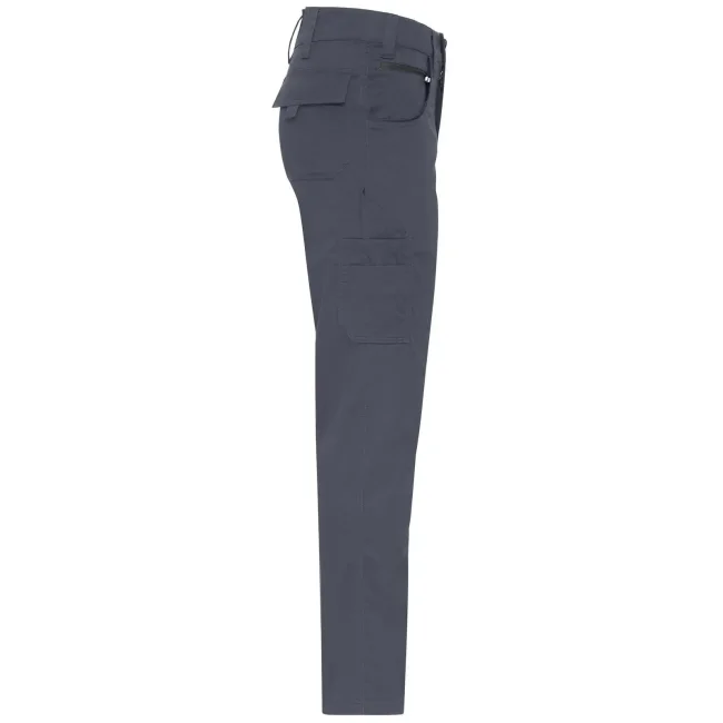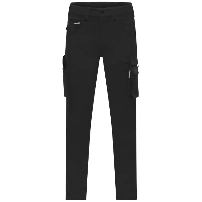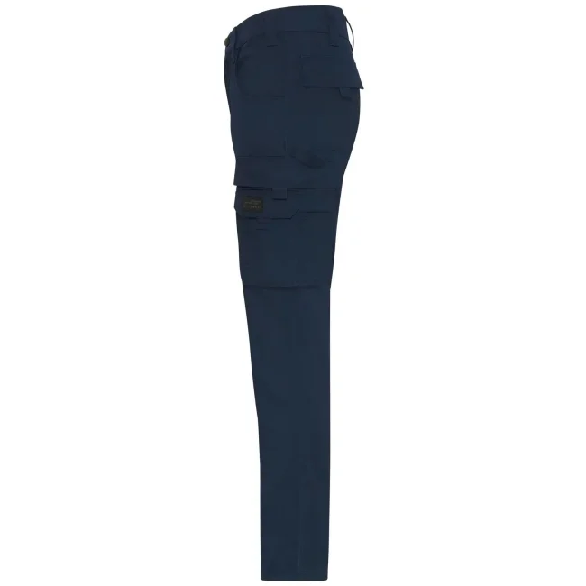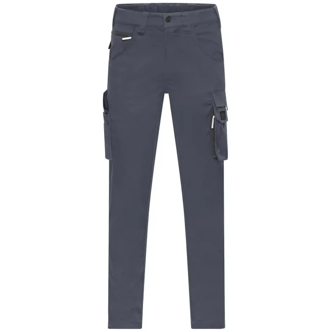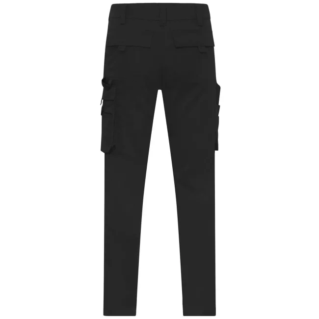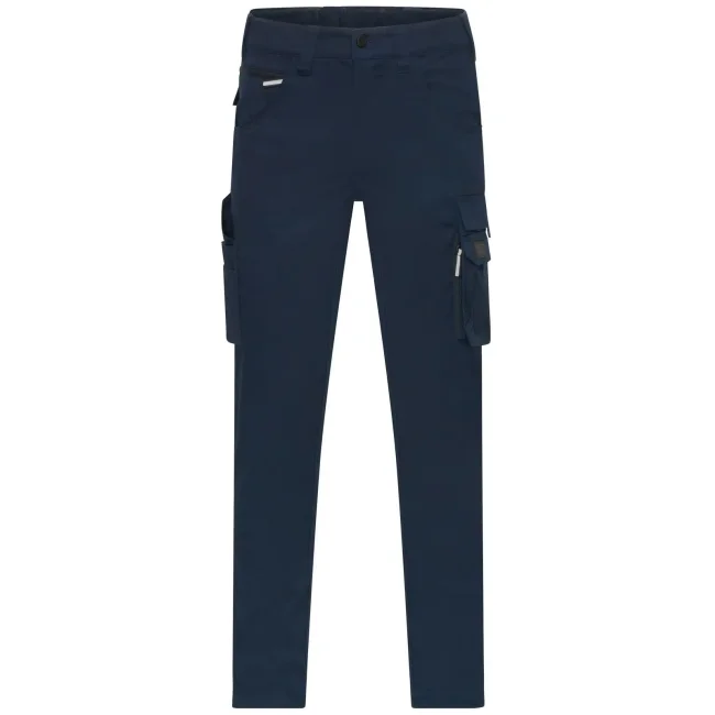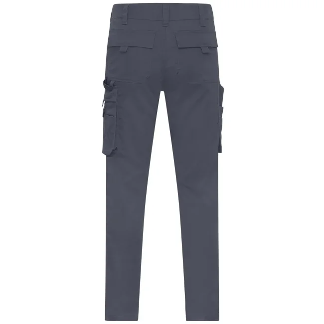48% cotone, 36% elastomultiestere, 16% poliammide. Pantaloni da lavoro slim, tessuti misti resistenti, elastici e leggeri con dettagli funzionali, vita con passanti, tripla cucitura antistrappo, tasche posteriori, diverse tasche portautensili, porta-metro, portapenne, 2 tasche con cerniera, zip YKK, lavabili a 40°C, adatti per l'asciugatura in asciugatrice.