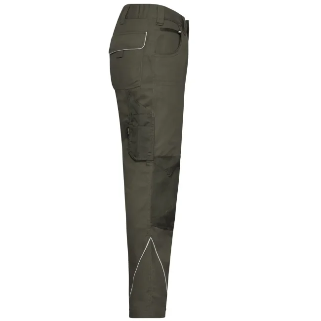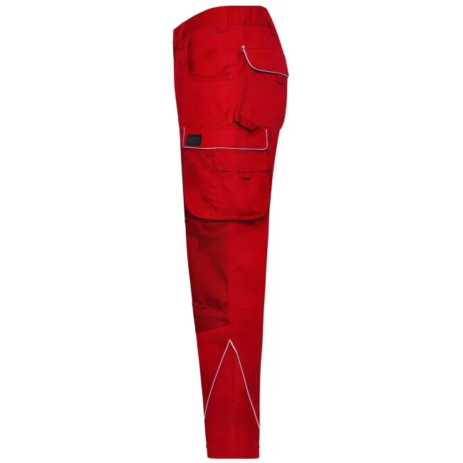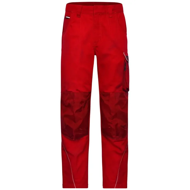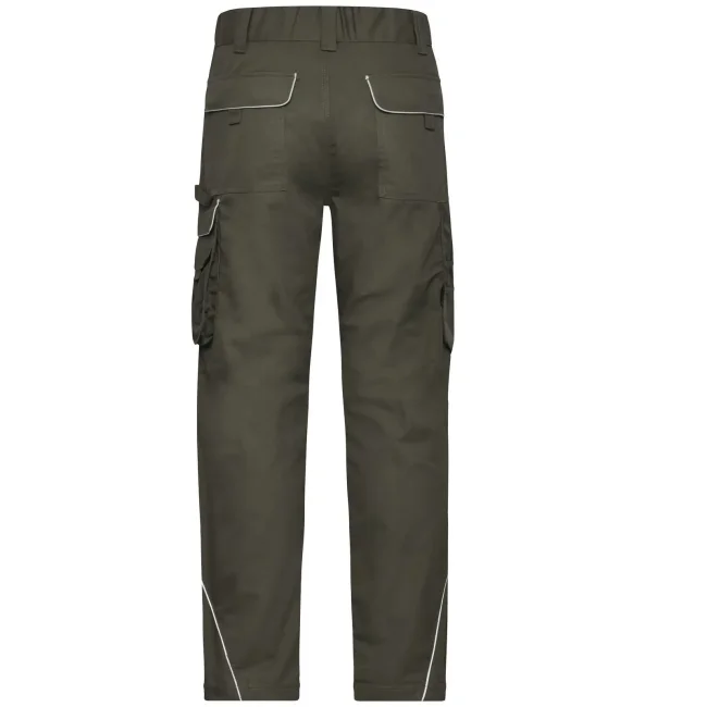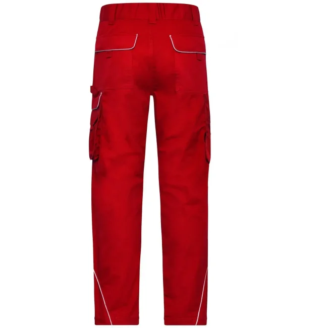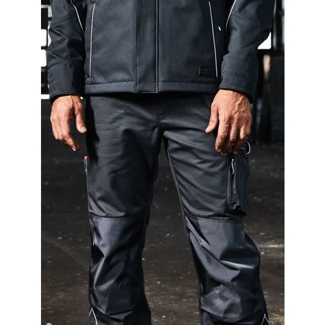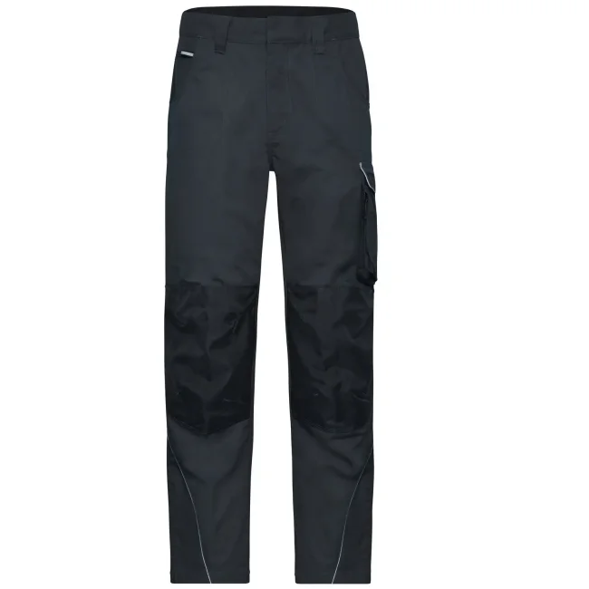 65% poliestere, 35% cotone, rifiniture 100% poliammide. Pantaloni da lavoro in tessuto misto resistente e robusto, girovita elastico con passanti per cintura, riforzo CORDURA sulle ginocchia, triple cuciture, tasche frontali, tasche porta attrezzi, due tasche con zip, taschino per cellulare, taschini porta-penna con rinforzo CORDURA, dettagli riflettenti (senza funzione protettiva / senza DPI) sulle tasche, sul davanti e sul retro, zip YKK, lavabile a 60° C e ideale per asciugatura in asciugatrice. Per evitare che il prodotto si rovini, tutti i bottoni e le zip sono nascosti.