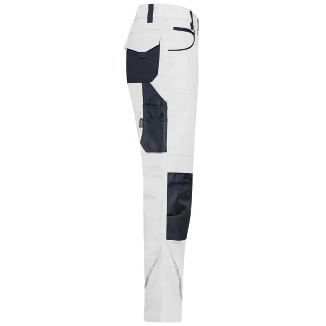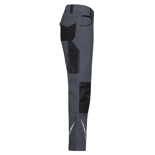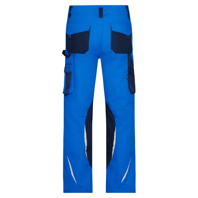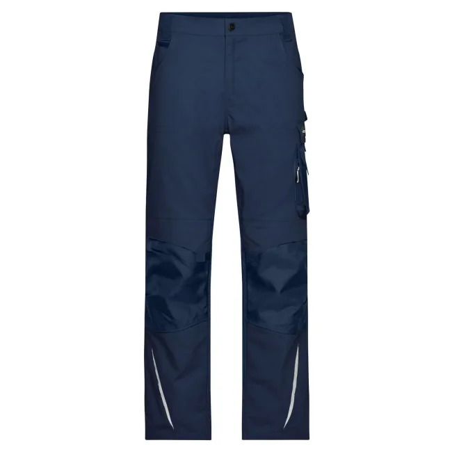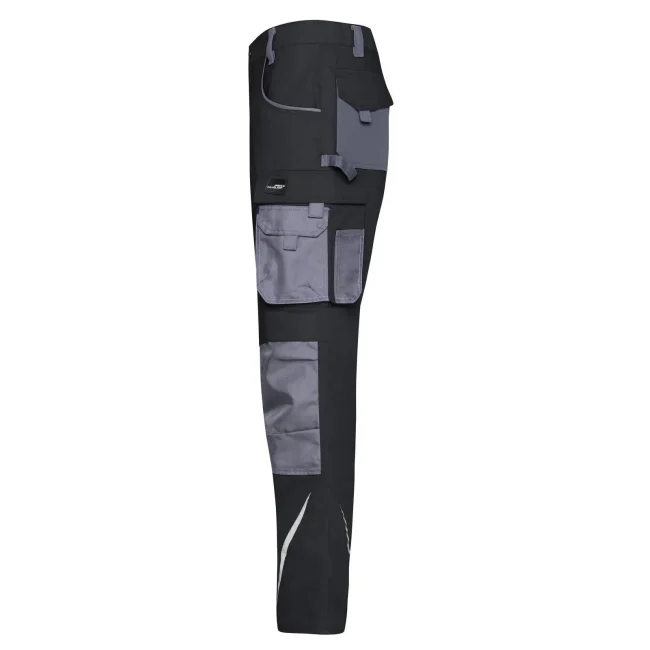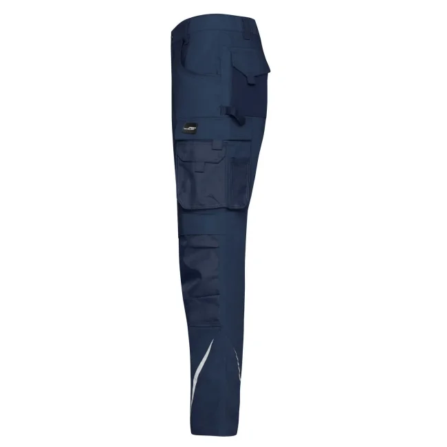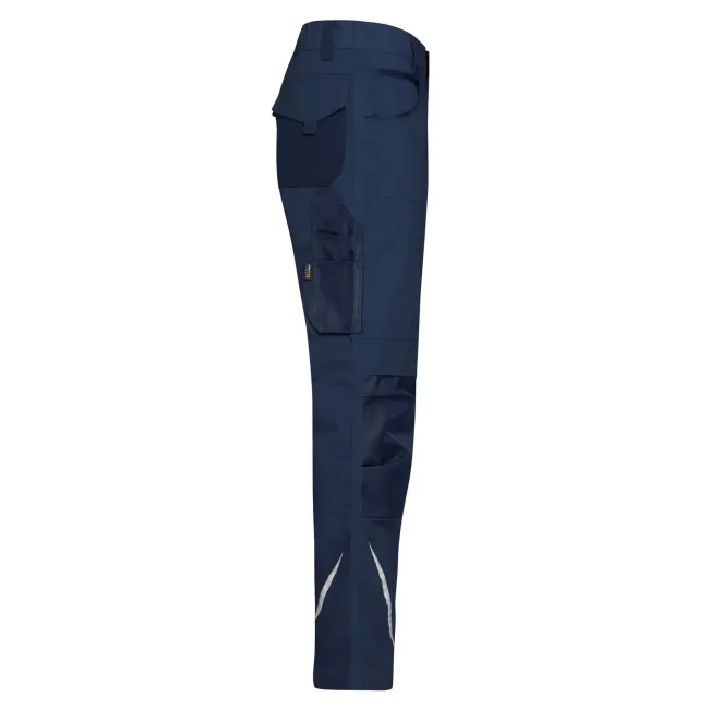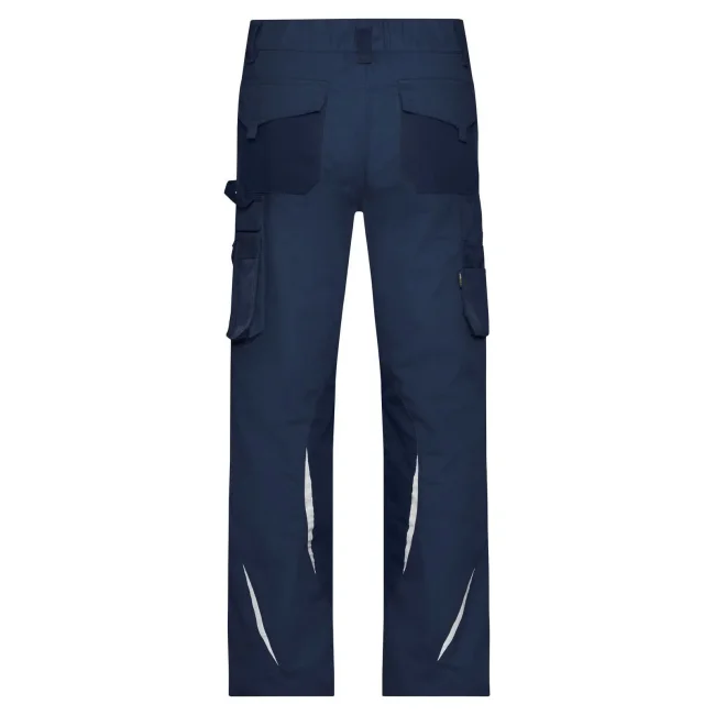 65% poliestere, 35% cotone. Pantaloni in tessuto robusto, tasche imbottite sulle ginocchia e rinforzate con cordura, tasche multi-funzionali per oggetti da lavoro, dettagli catarifrangenti sia davanti che sul retro.