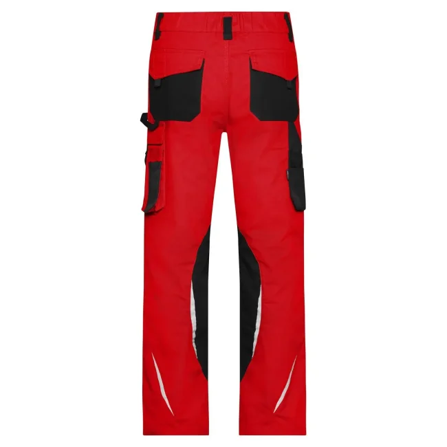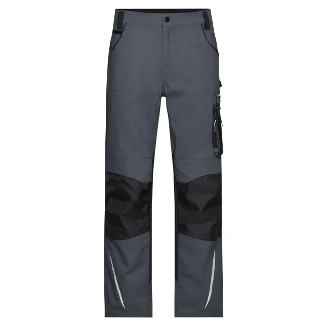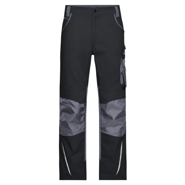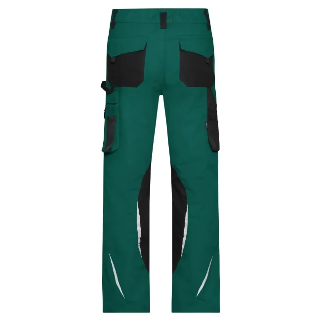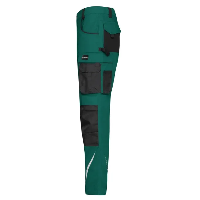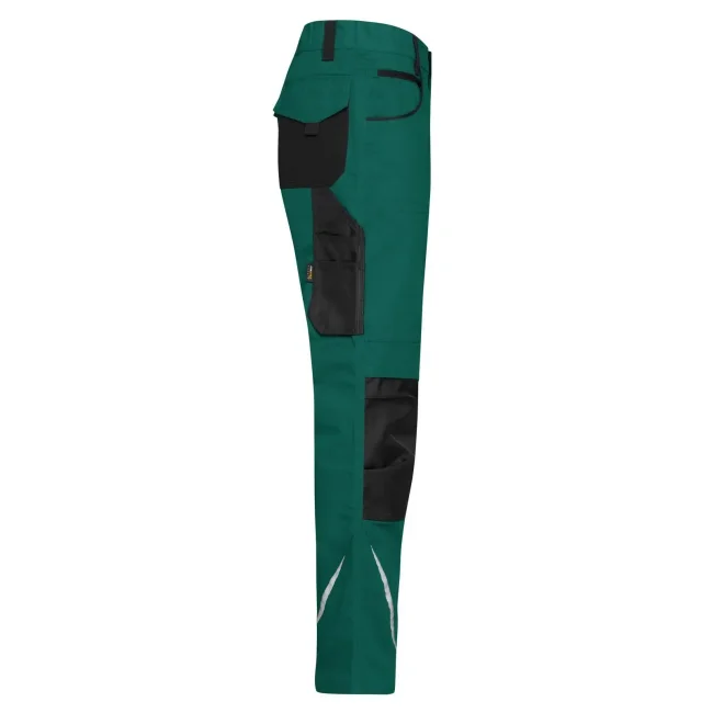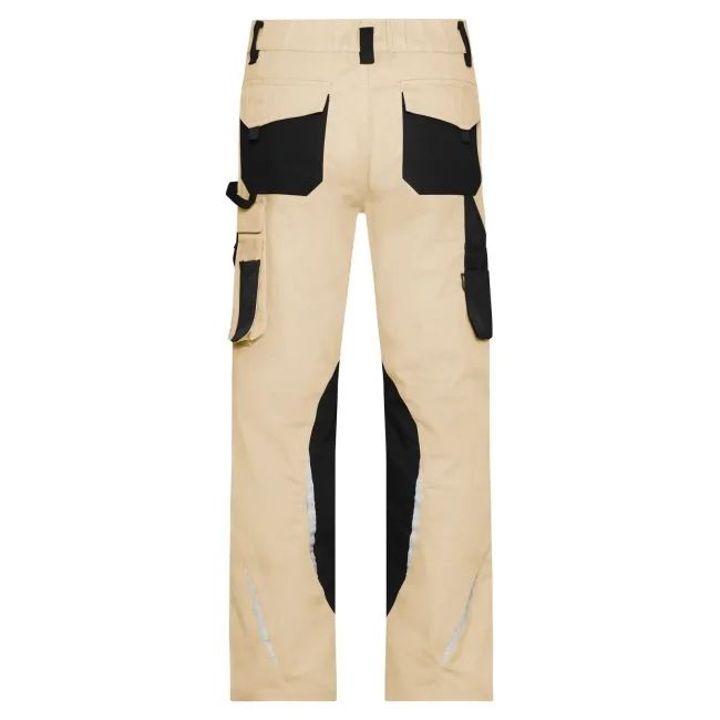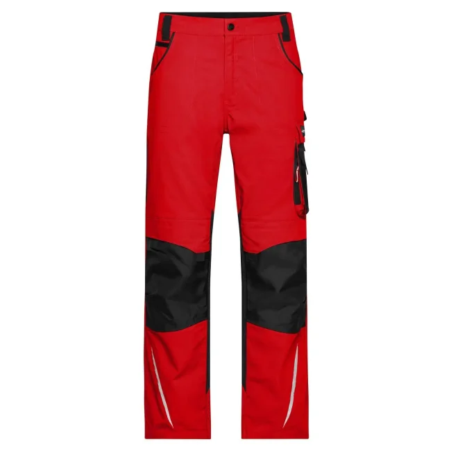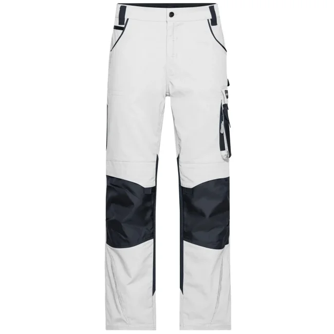 65% poliestere, 35% cotone. Pantaloni in tessuto robusto, tasche imbottite sulle ginocchia e rinforzate con cordura, tasche multi-funzionali per oggetti da lavoro, dettagli catarifrangenti sia davanti che sul retro.