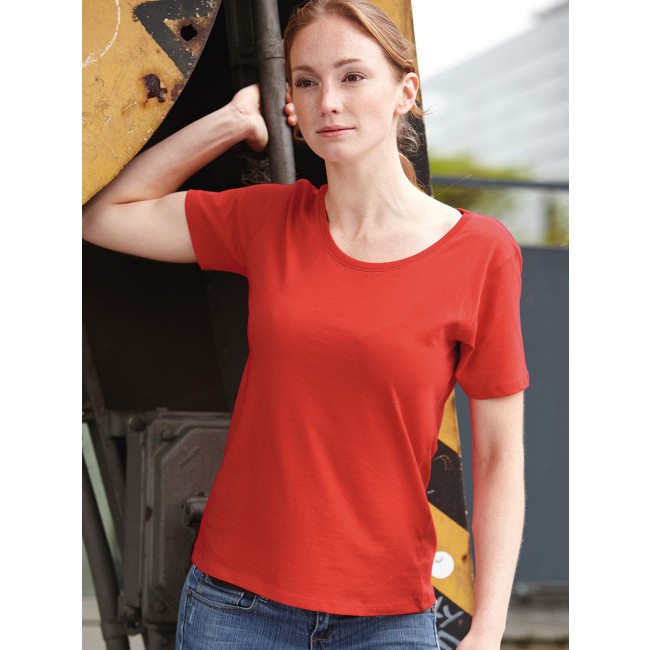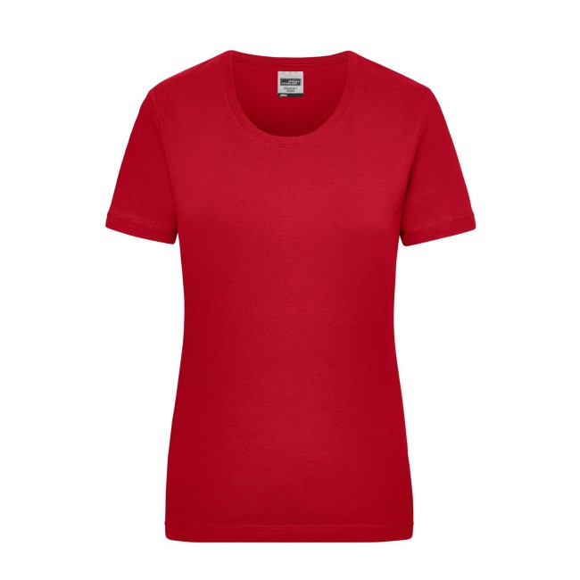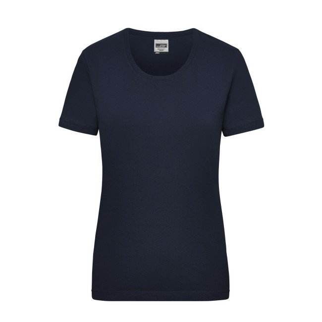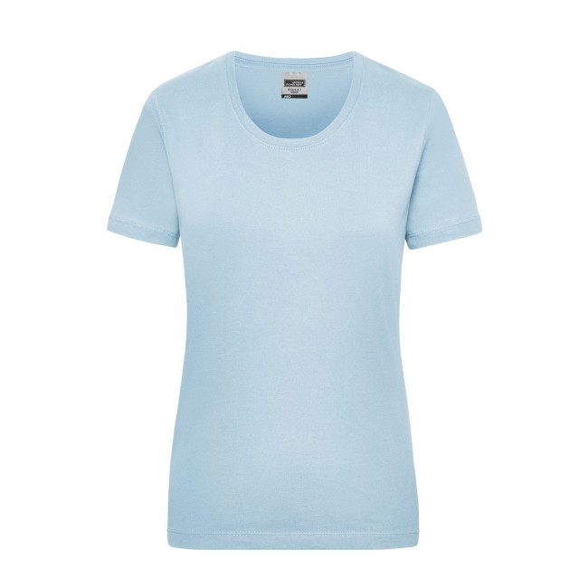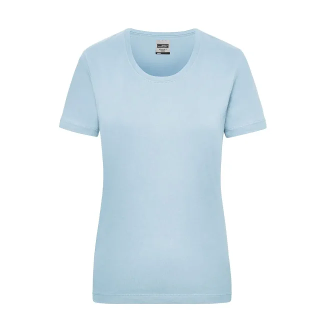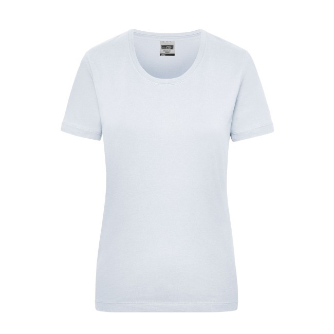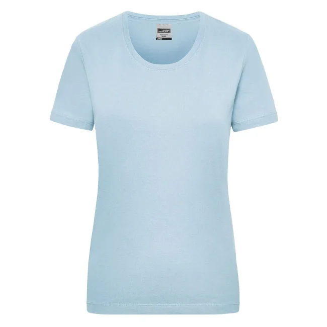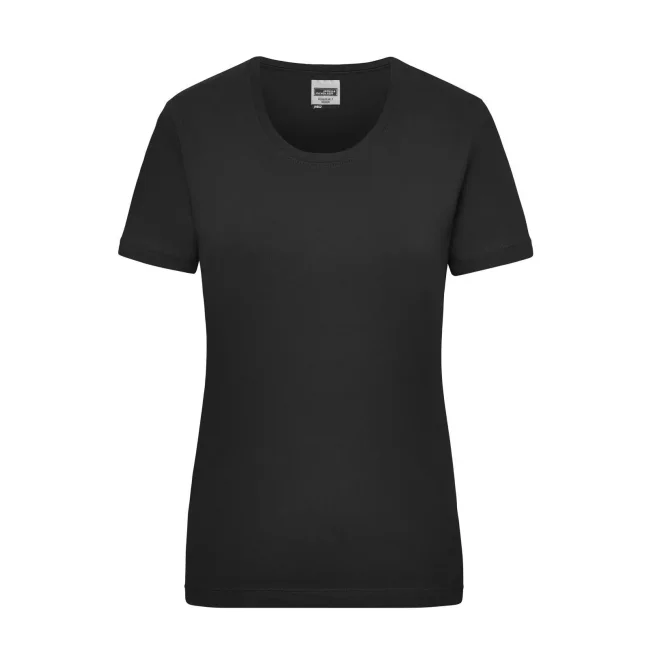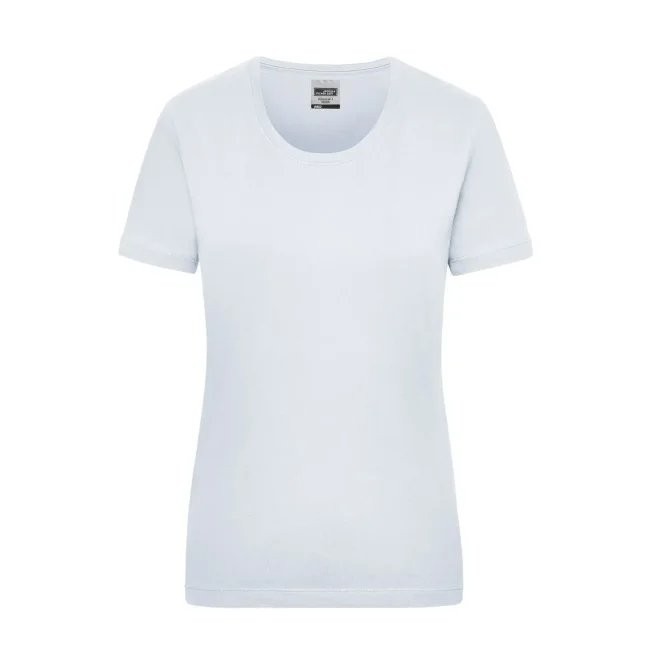 100% cotone. T-shirt classica resistente Single-jersey di alta qualità pretrattato, mantiene la forma. Taglio ottimale per ampi movimenti, Cucitura doppia per alta tenuta, necktape, Leggermente sciancrata. Bianco lavabile a 95°C, adatto per asciugabiancheria, Colorato lavabile a 60°C, adatto per asciugabiancheria. Tessuto esterno (200 g/m²), manica corta, Donna, Professionale, Collo rotondo.